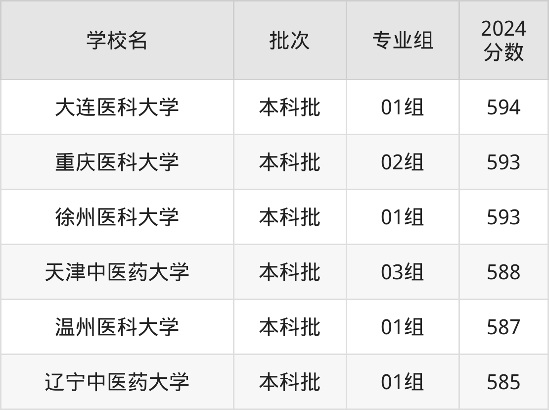 为给各位考生更加详细的参考,下文整理了2024年录取分数线在585分到595分之间的医药类大学名单汇总。