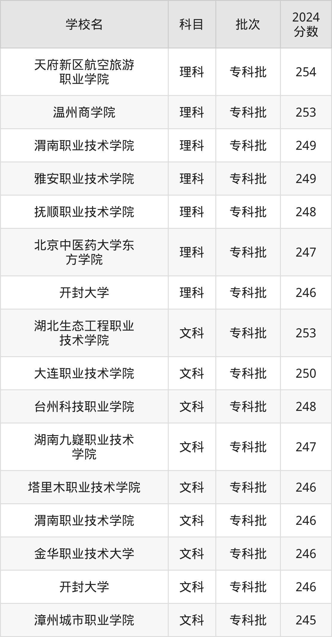 理科科目考生能上的有7所,包括2所本科医科大学和5所专科医科大学。具体有:天府新区航空旅游职业学院(254分)、温州商学院(253分)、渭南职业技术学院(249分)、雅安职业技术学院(249分)等;
