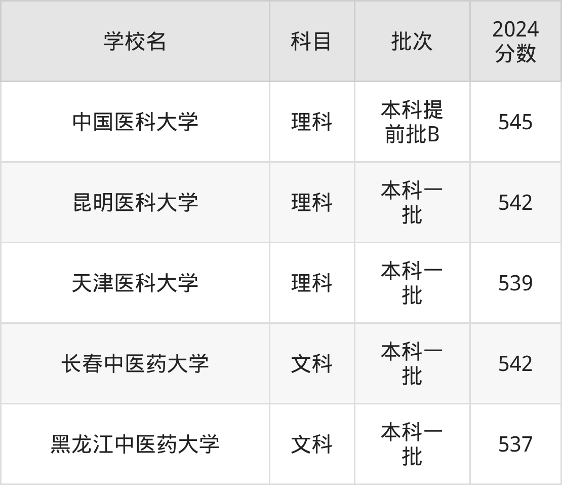 理科科目考生能上的有3所,全部在本科批次录取。具体有:中国医科大学(545分)、昆明医科大学(542分)、天津医科大学(539分);