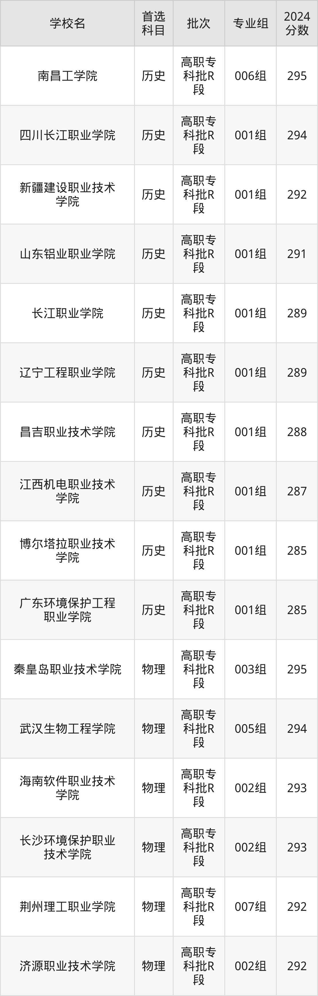 首选历史科目考生能上的有10所,包括1所本科医科大学和9所专科医科大学。具体有:南昌工学院006组(295分)、四川长江职业学院001组(294分)、新疆建设职业技术学院001组(292分)、山东铝业职业学院001组(291分)等;