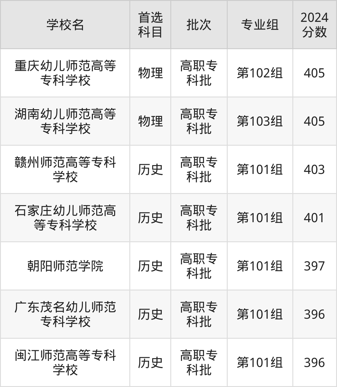 首选物理科目考生能上的有2所,全部在专科批次录取。具体有:重庆幼儿师范高等专科学校第102组(405分)、湖南幼儿师范高等专科学校第103组(405分);