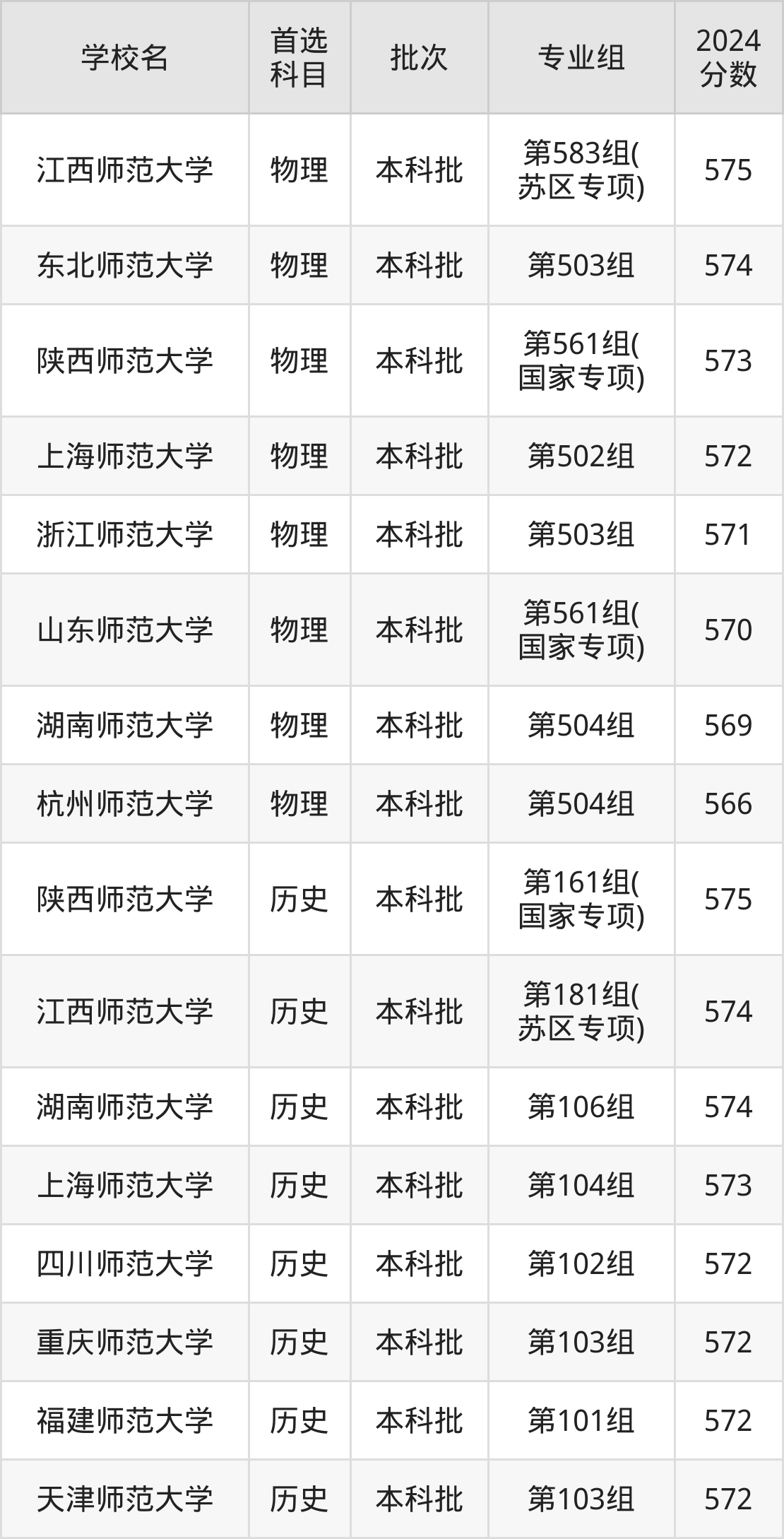 首选物理科目考生能上的有8所,全部在本科批次录取。具体有:江西师范大学第583组(苏区专项)(575分)、东北师范大学第503组(574分)、陕西师范大学第561组(国家专项)(573分)、上海师范大学第502组(572分)等;