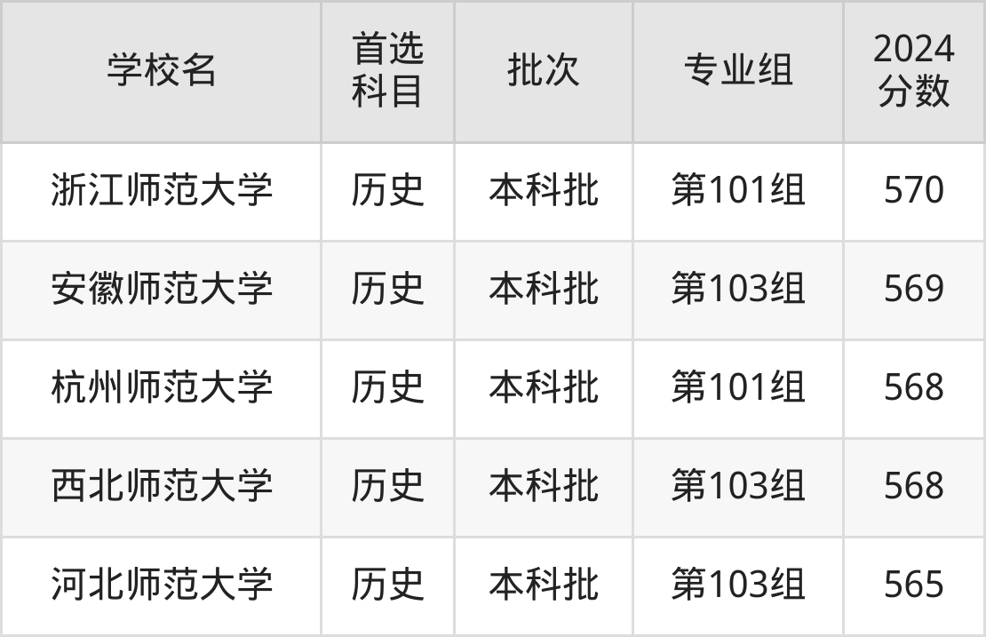 首选历史科目考生能上的有13所,全部在本科批次录取。具体有:陕西师范大学第161组(国家专项)(575分)、江西师范大学第181组(苏区专项)(574分)、湖南师范大学第106组(574分)、上海师范大学第104组(573分)等。