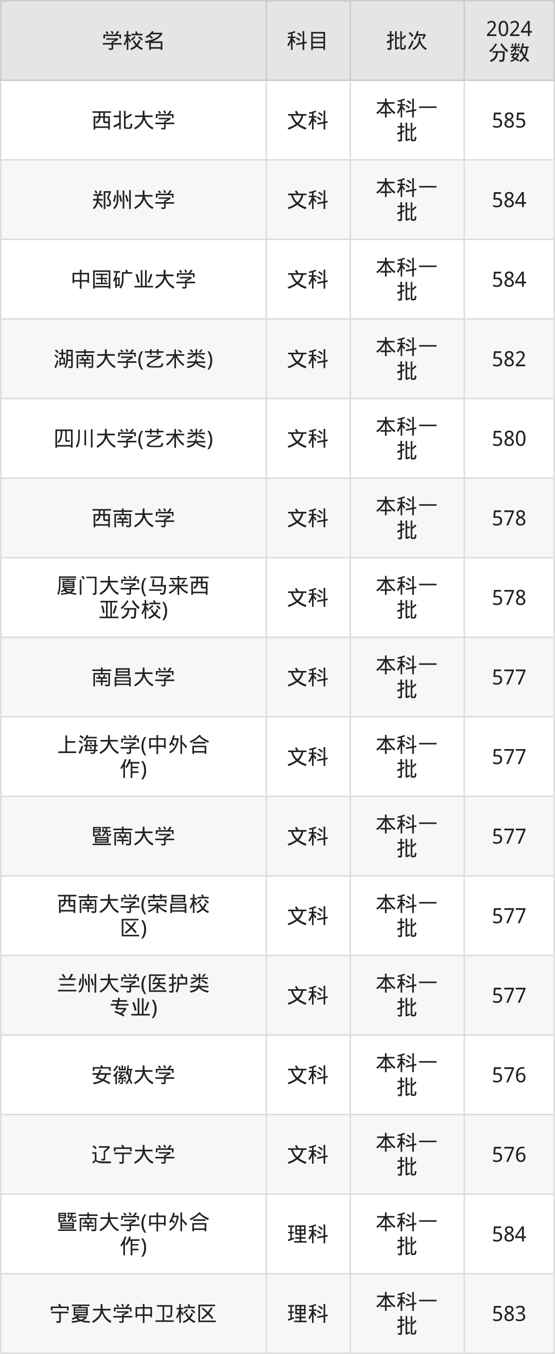 文科科目考生能上的有14所,全部在本科批次录取。具体有:西北大学(585分)、郑州大学(584分)、中国矿业大学(584分)、湖南大学(艺术类)(582分)等;