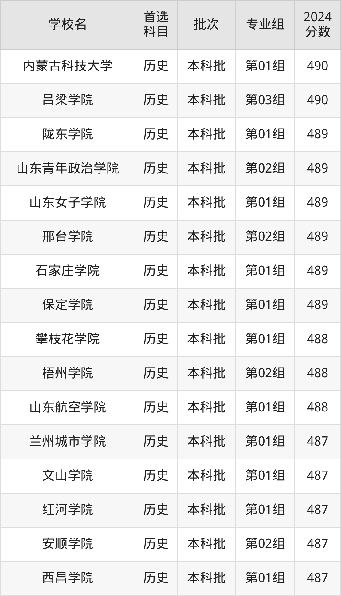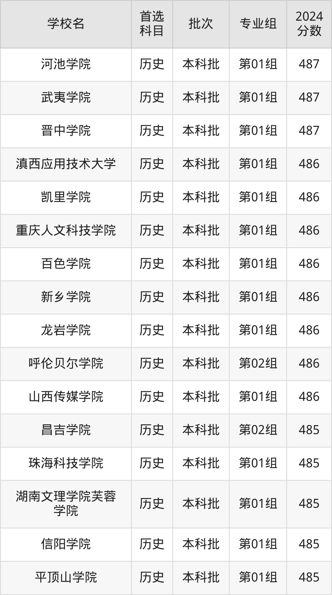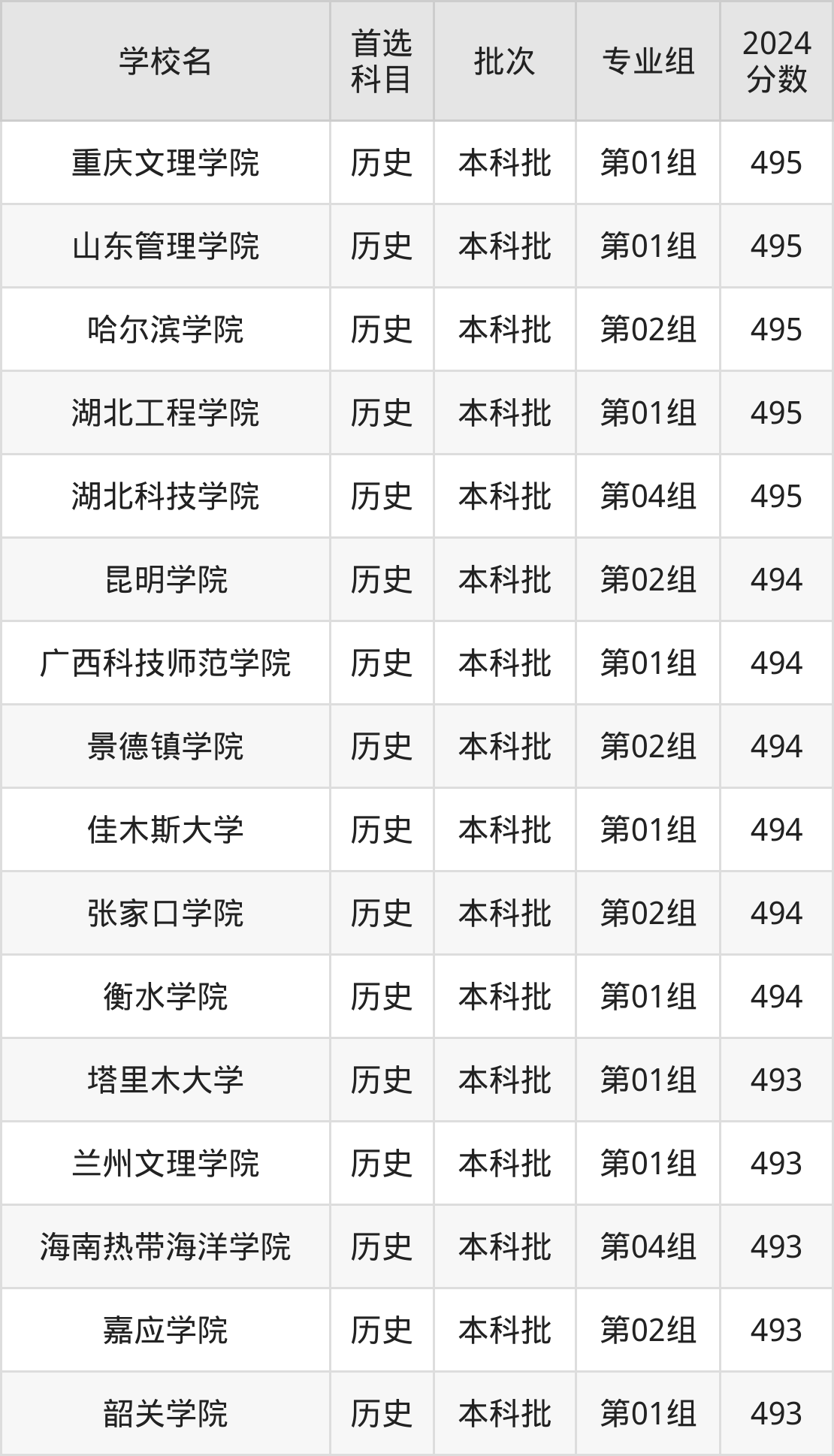 首选历史科目考生能上的有66所,全部在本科批次录取。具体有:重庆文理学院第01组(495分)、山东管理学院第01组(495分)、哈尔滨学院第02组(495分)、湖北工程学院第01组(495分)等;