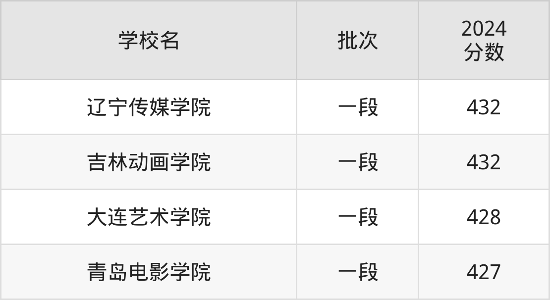 考生能上的有4所,全部在本科批次录取。具体有:辽宁传媒学院(432分)、吉林动画学院(432分)、大连艺术学院(428分)、青岛电影学院(427分)等。