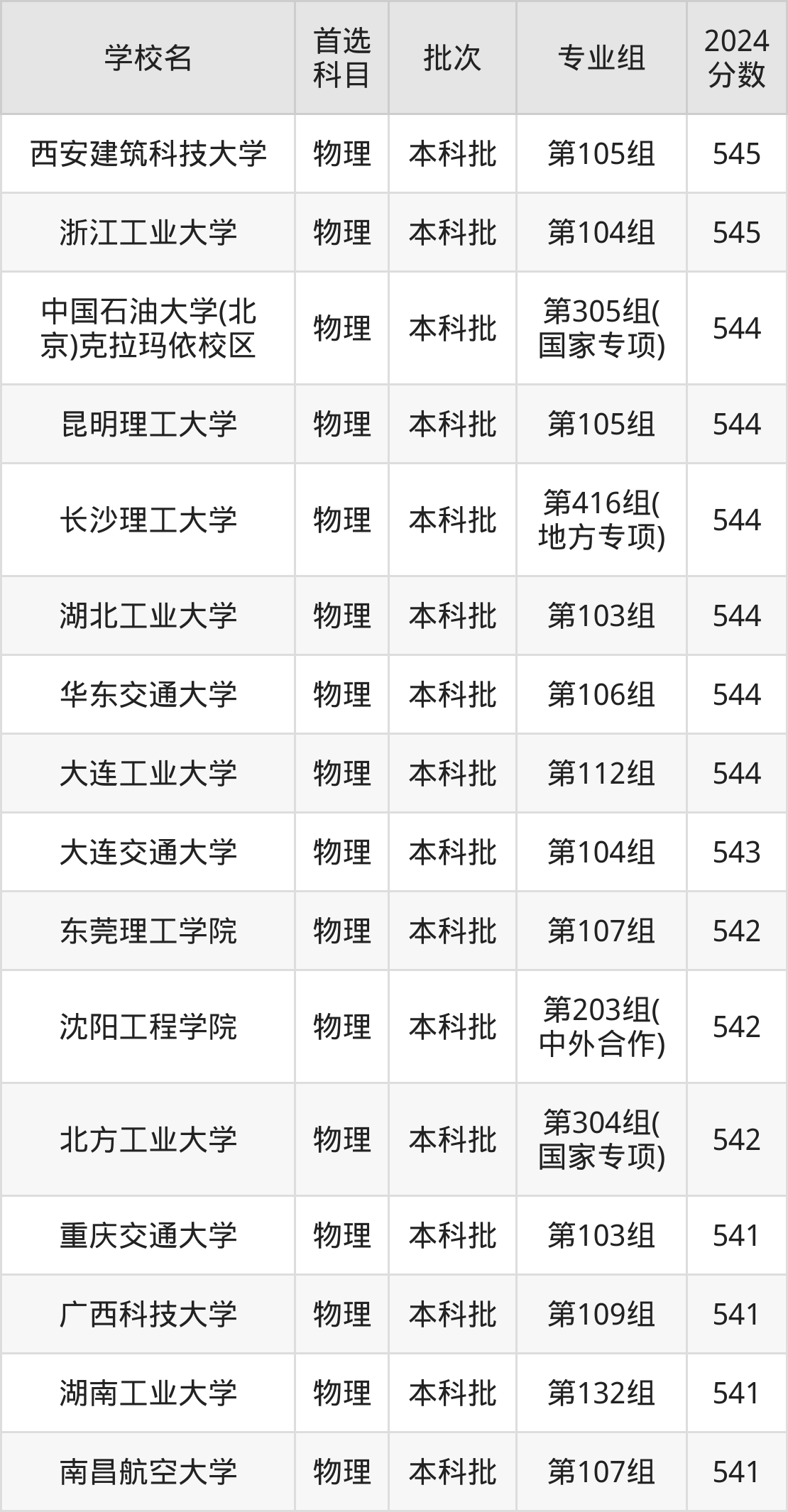 首选物理科目考生能上的有36所,全部在本科批次录取。具体有:西安建筑科技大学第105组(545分)、浙江工业大学第104组(545分)、中国石油大学(北京)克拉玛依校区第305组(国家专项)(544分)、昆明理工大学第105组(544分)等;