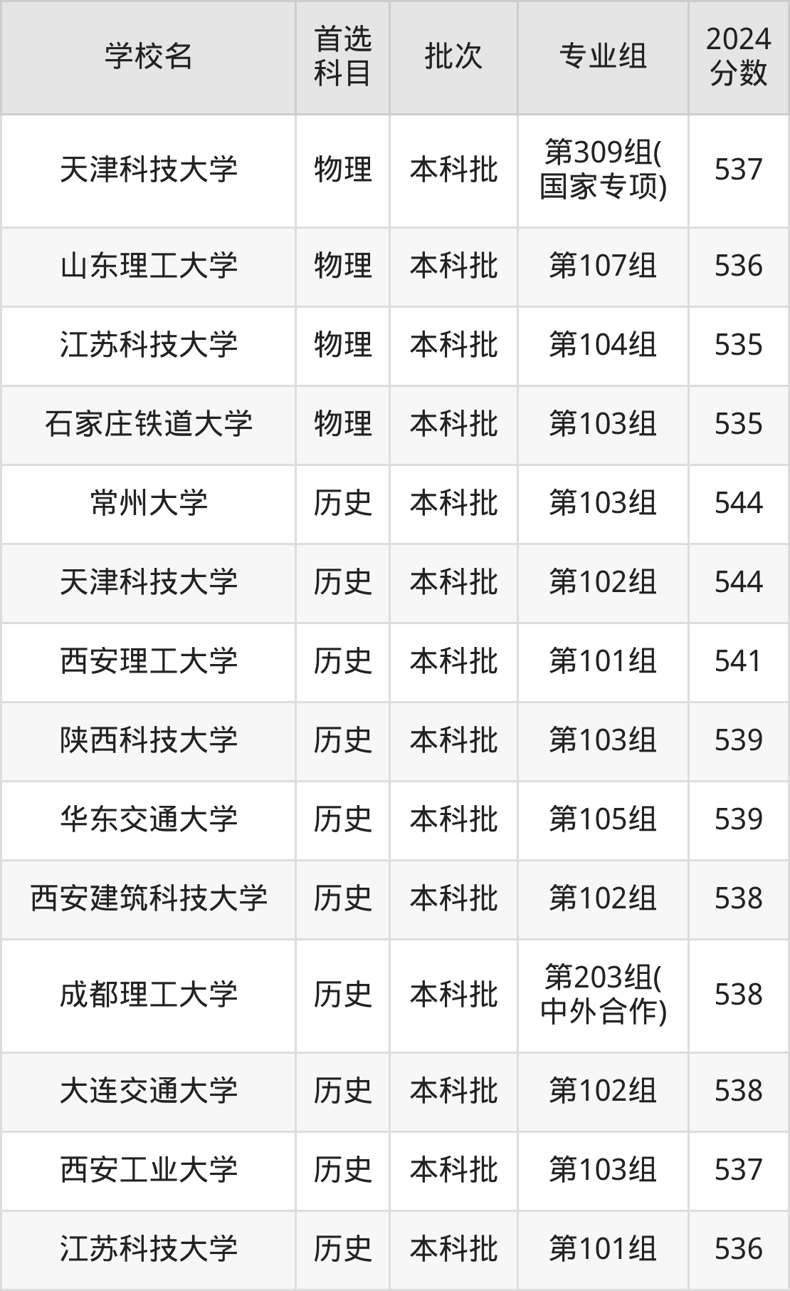 首选历史科目考生能上的有10所,全部在本科批次录取。具体有:常州大学第103组(544分)、天津科技大学第102组(544分)、西安理工大学第101组(541分)、陕西科技大学第103组(539分)等。