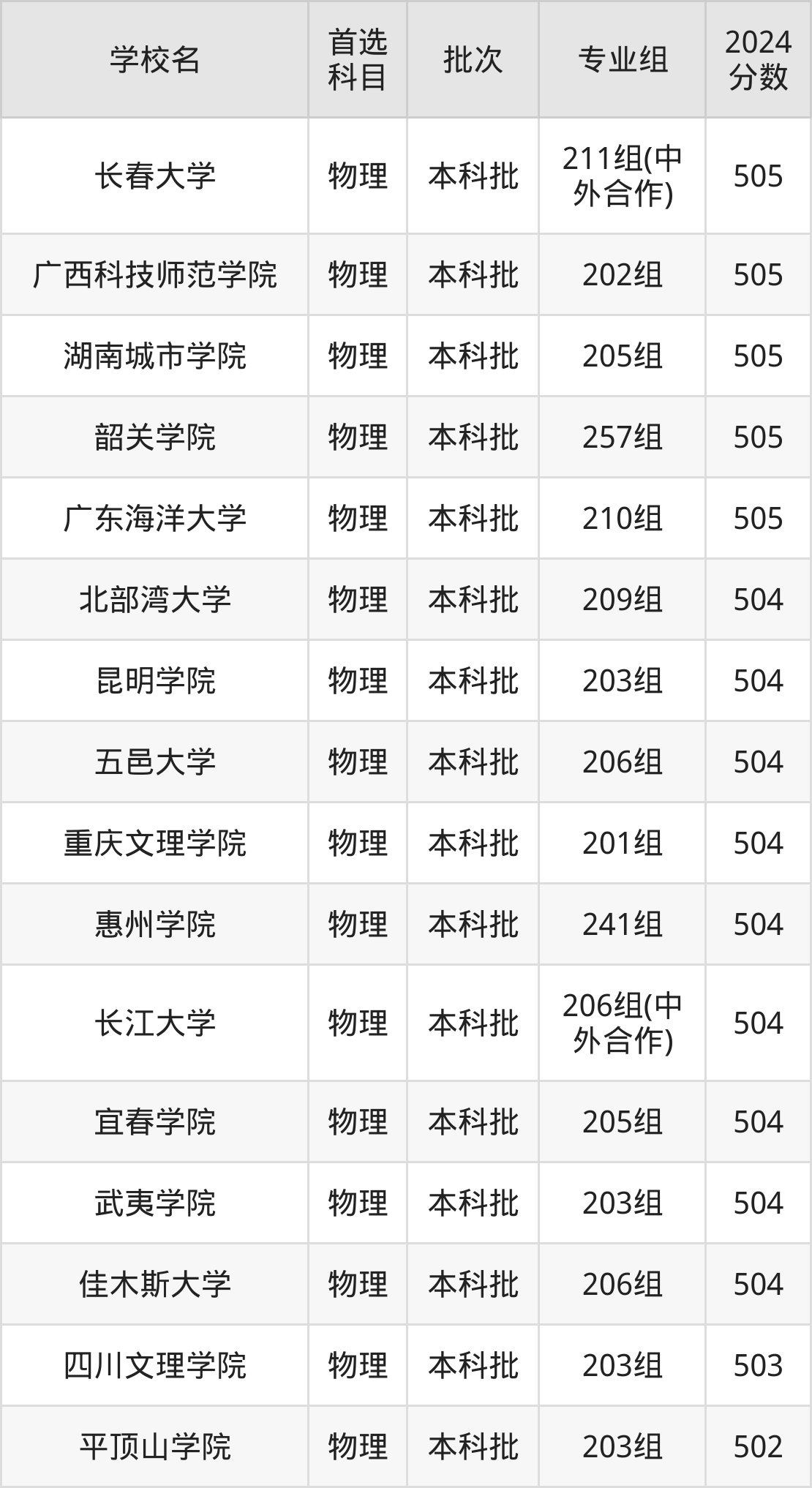 首选物理科目考生能上的有59所,包括58所本科医科大学和1所专科医科大学。具体有:长春大学211组(中外合作)(505分)、广西科技师范学院202组(505分)、湖南城市学院205组(505分)、韶关学院257组(505分)等;