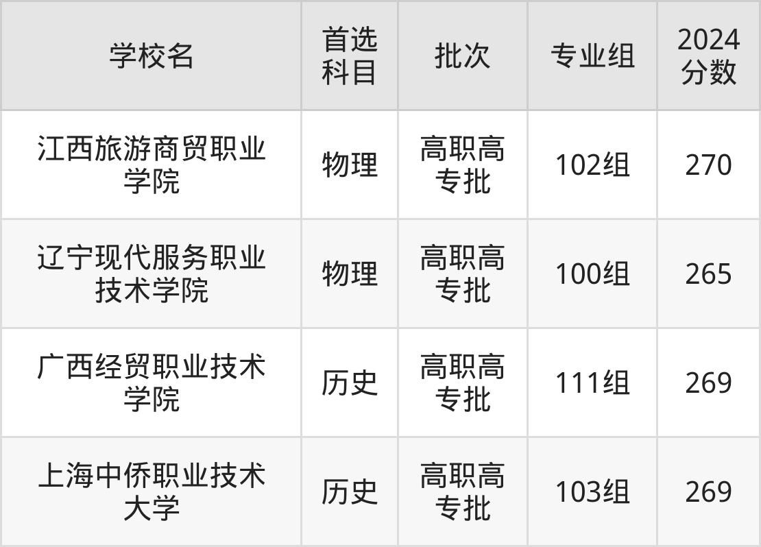 首选物理科目考生能上的有2所,全部在专科批次录取。具体有:江西旅游商贸职业学院102组(270分)、辽宁现代服务职业技术学院100组(265分);