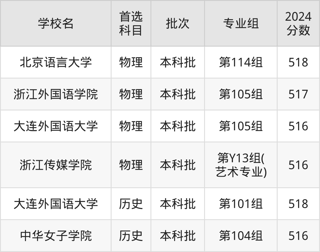 首选物理科目考生能上的有4所,全部在本科批次录取。具体有:北京语言大学第114组(518分)、浙江外国语学院第105组(517分)、大连外国语大学第105组(516分)、浙江传媒学院第Y13组(艺术专业)(516分)等;