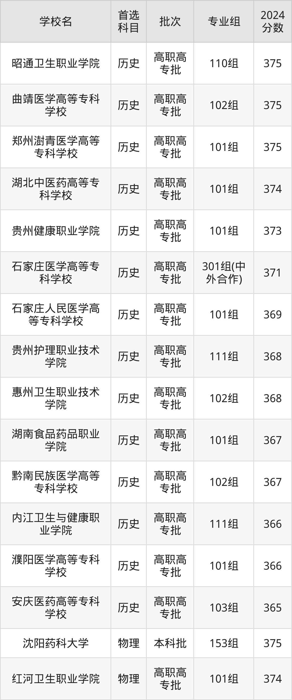 为给各位考生更加详细的参考,下文整理了2024年录取分数线在365分到375分之间的医药类大学名单汇总。