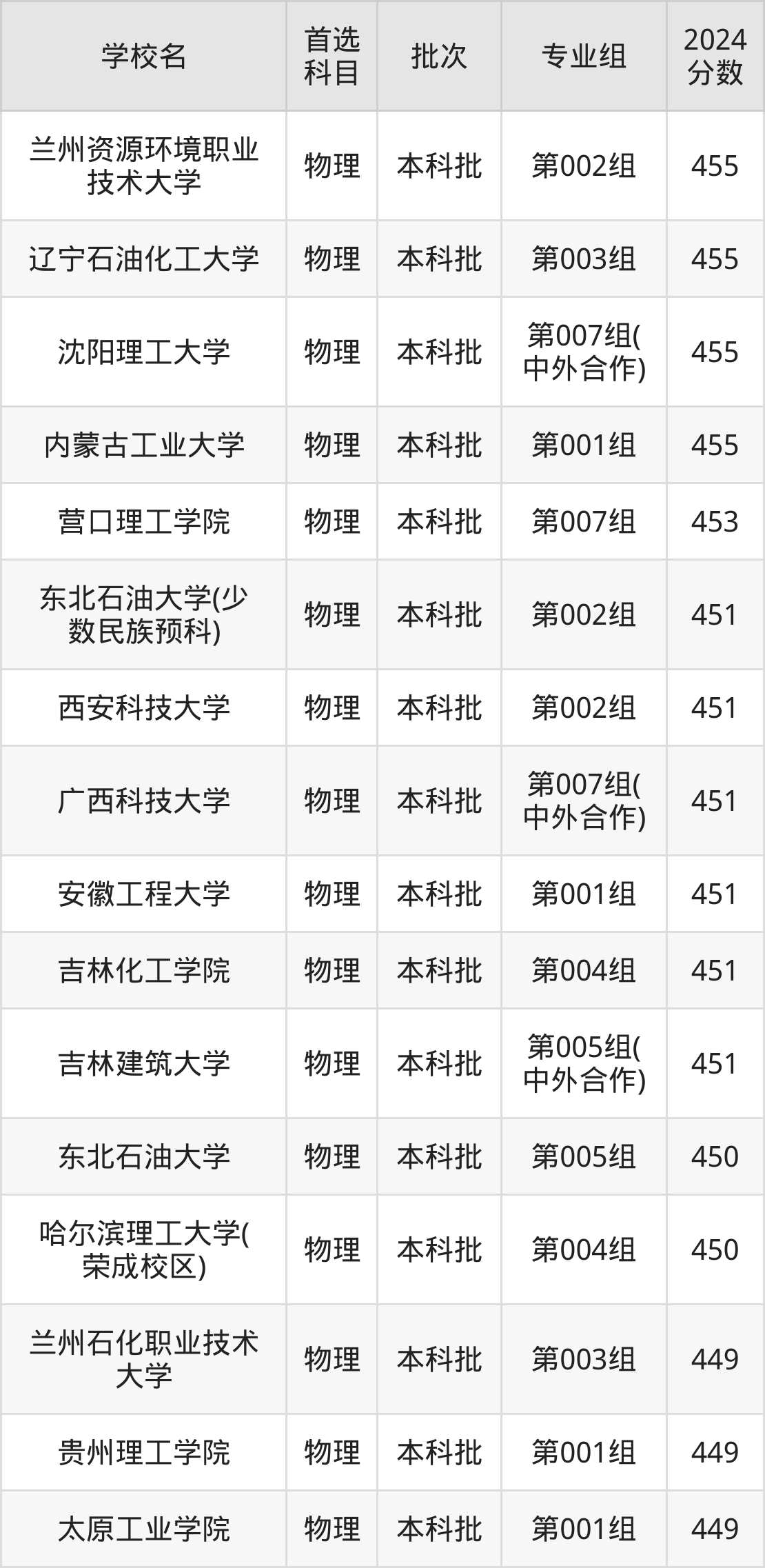 首选物理科目考生能上的有24所,全部在本科批次录取。具体有:兰州资源环境职业技术大学第002组(455分)、辽宁石油化工大学第003组(455分)、沈阳理工大学第007组(中外合作)(455分)、内蒙古工业大学第001组(455分)等;