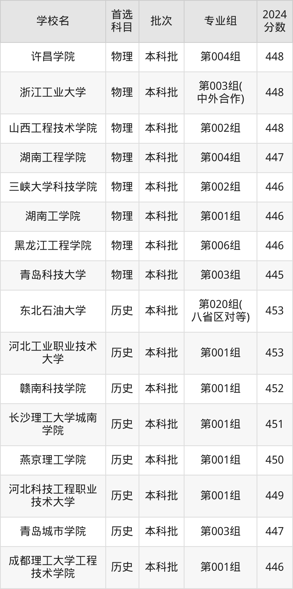 首选历史科目考生能上的有11所,全部在本科批次录取。具体有:东北石油大学第020组(八省区对等)(453分)、河北工业职业技术大学第001组(453分)、赣南科技学院第001组(452分)、长沙理工大学城南学院第001组(451分)等。