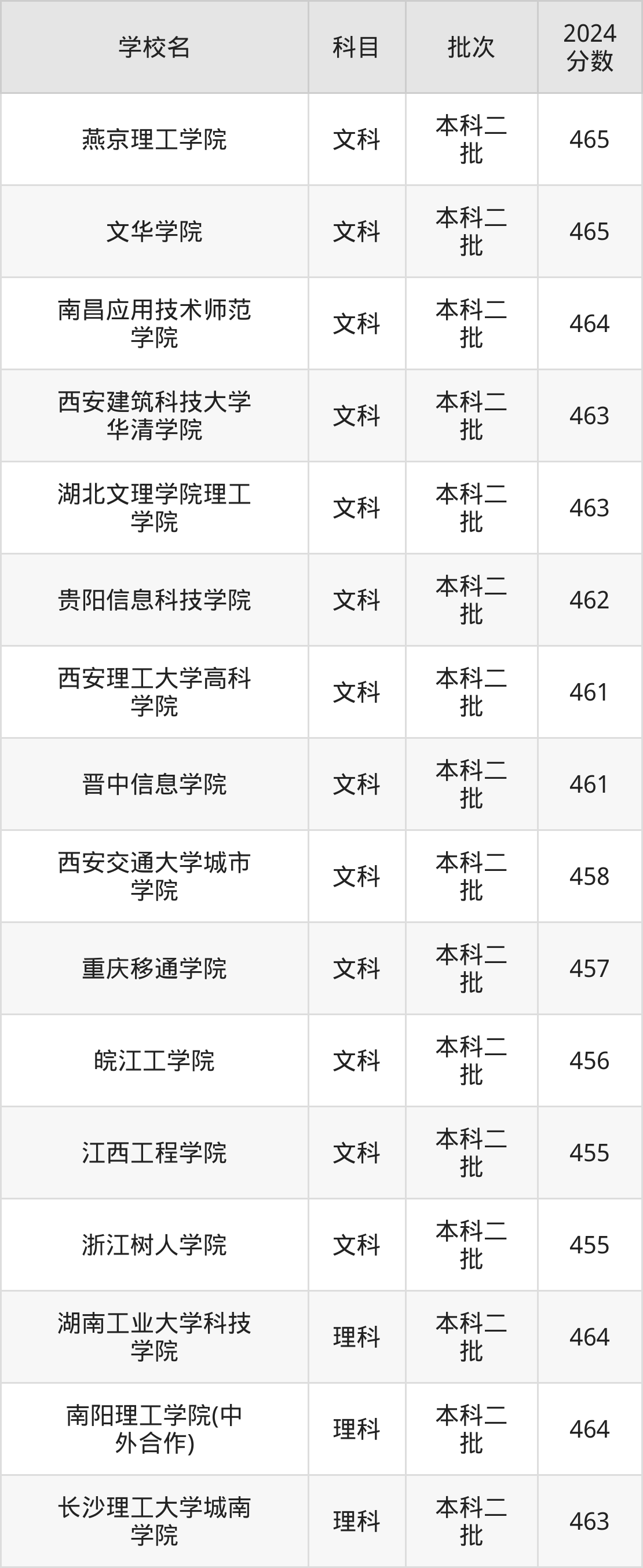 文科科目考生能上的有13所,全部在本科批次录取。具体有:燕京理工学院(465分)、文华学院(465分)、南昌应用技术师范学院(464分)、西安建筑科技大学华清学院(463分)等;