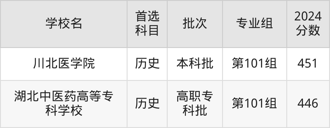 首选历史科目考生能上的有2所,包括1所本科医科大学和1所专科医科大学。具体有:川北医学院第101组(451分)、湖北中医药高等专科学校第101组(446分)。