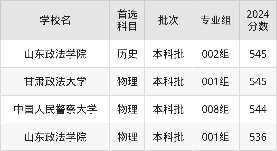 首选物理科目考生能上的有3所,全部在本科批次录取。具体有:甘肃政法大学001组(545分)、中国人民警察大学008组(544分)、山东政法学院001组(536分)。