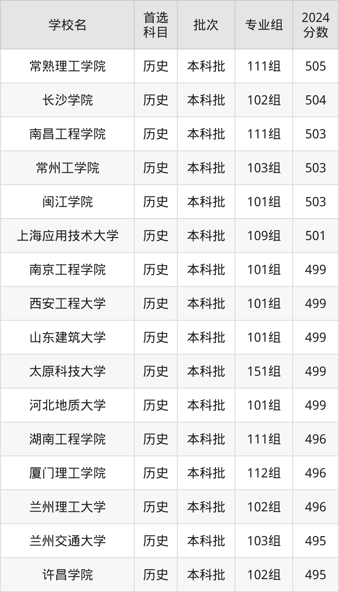 首选历史科目考生能上的有17所,全部在本科批次录取。具体有:常熟理工学院111组(505分)、长沙学院102组(504分)、南昌工程学院111组(503分)、常州工学院103组(503分)等;