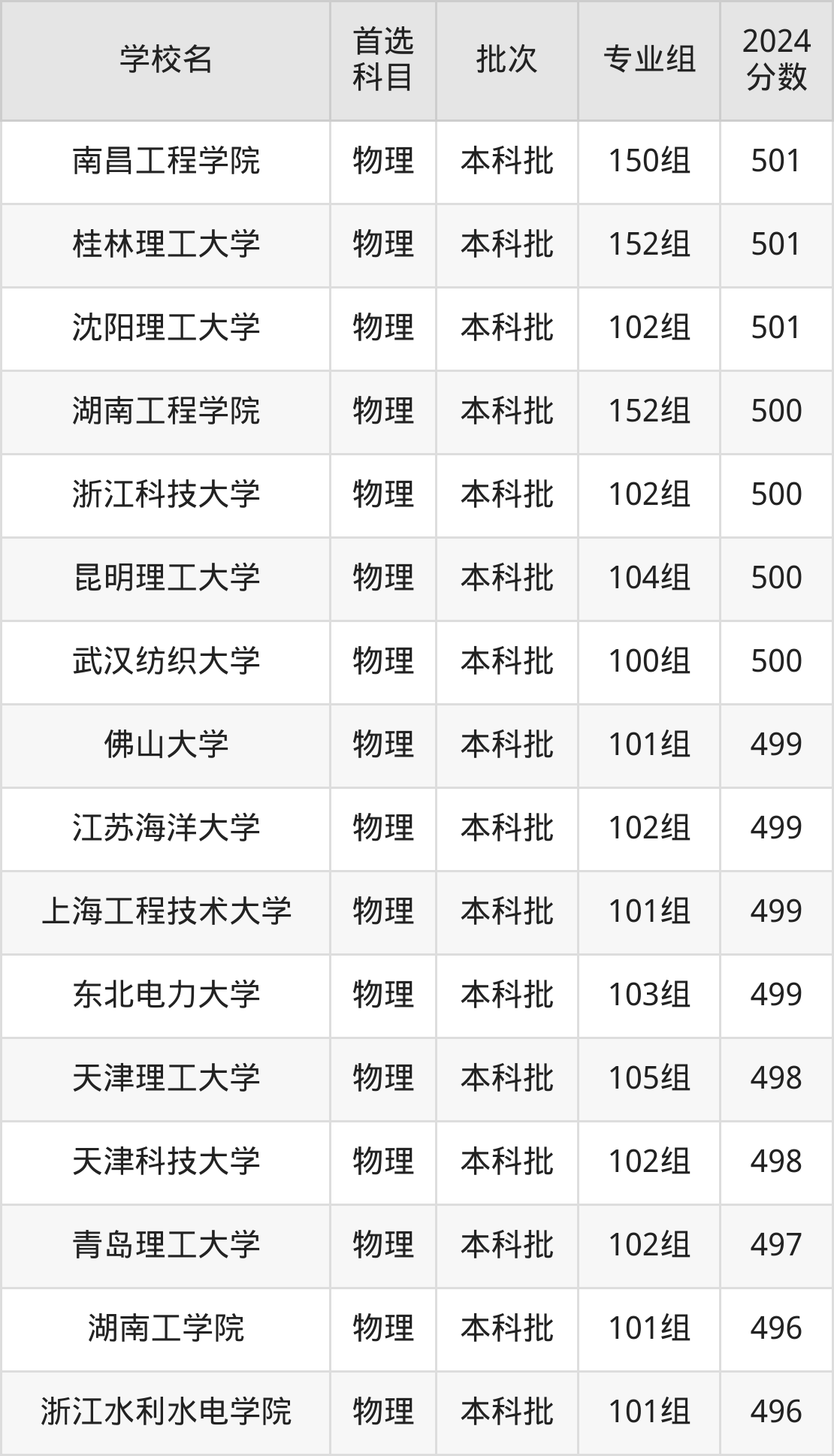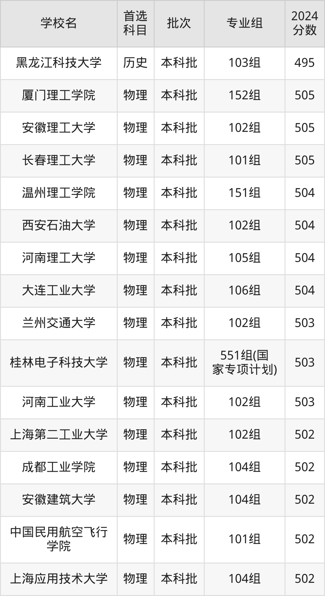 为给各位考生更加详细的参考,下文整理了2024年录取分数线在495分到505分之间的理工类大学名单汇总。