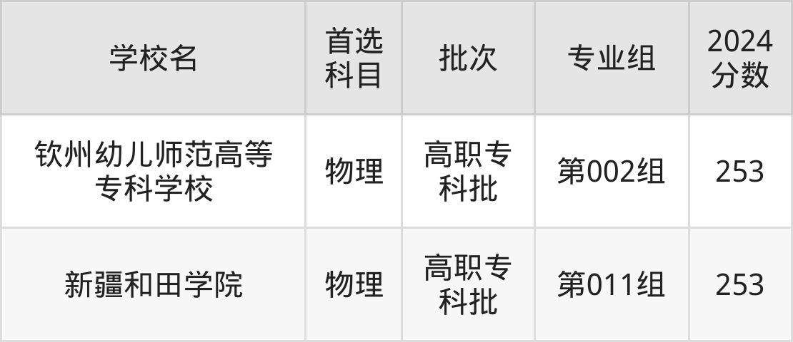 1、钦州幼儿师范高等专科学校(2024年物理类第002组253分)