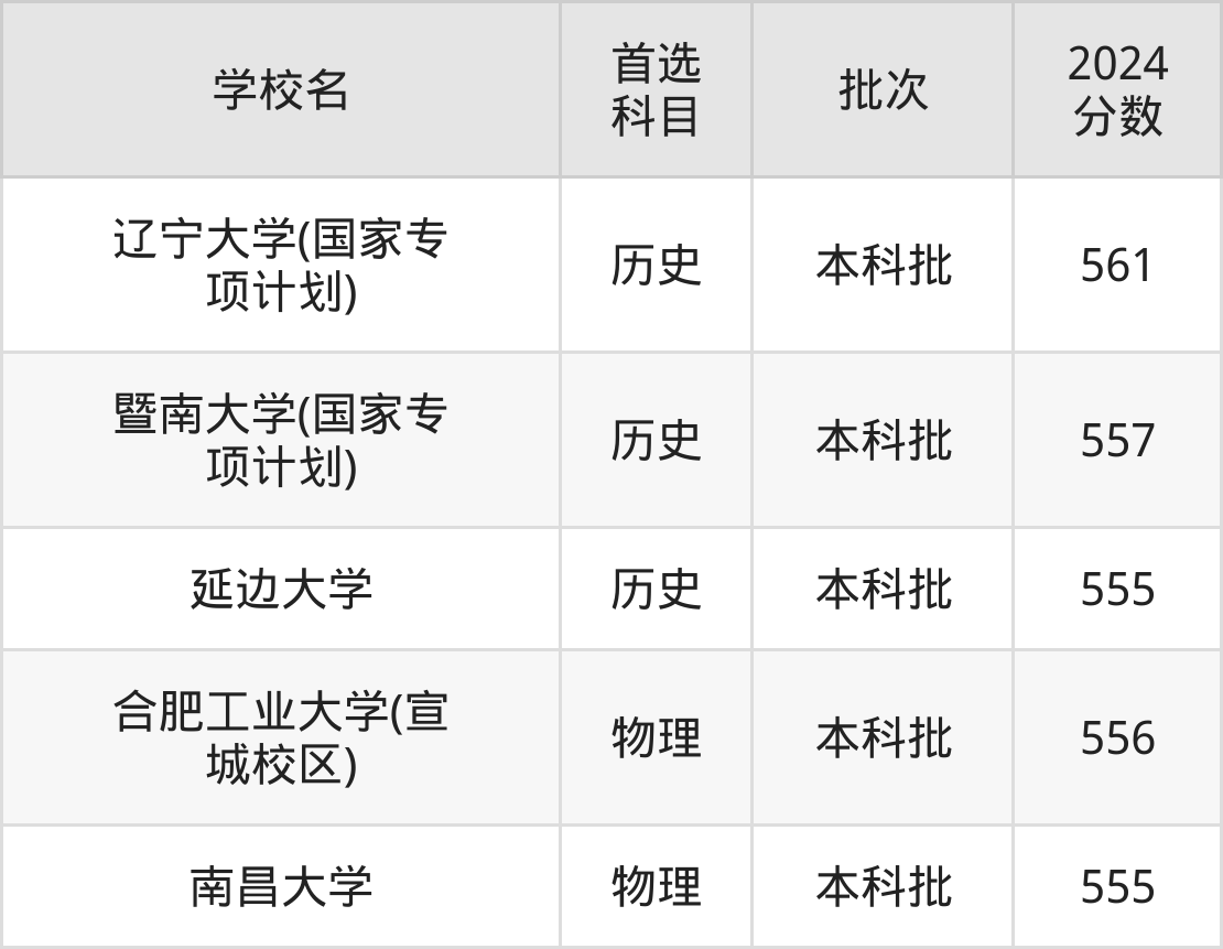 首选历史科目考生能上的有3所,全部在本科批次录取。具体有:辽宁大学(国家专项计划)(561分)、暨南大学(国家专项计划)(557分)、延边大学(555分);