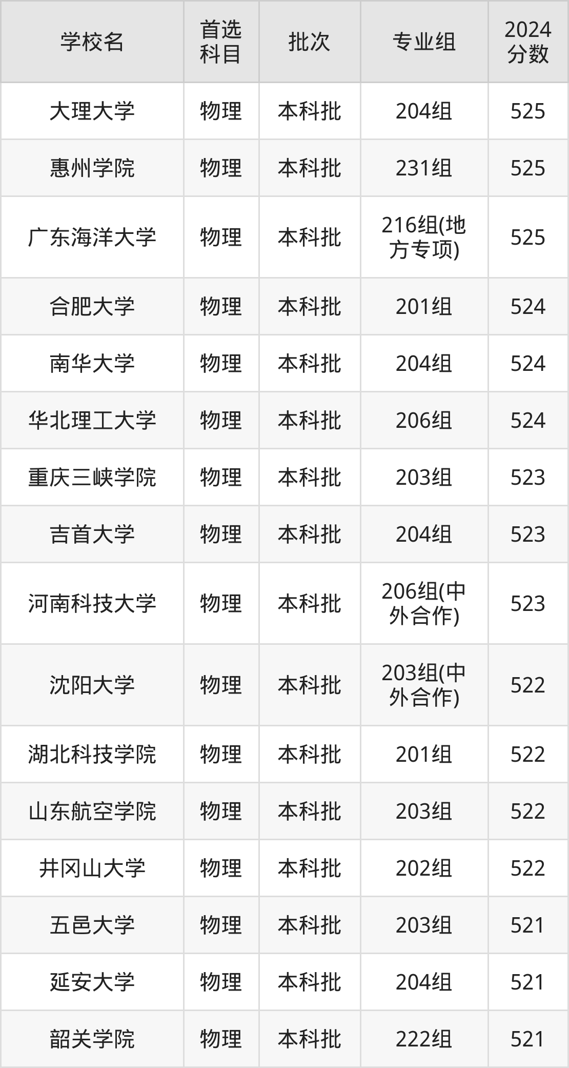 首选物理科目考生能上的有27所,全部在本科批次录取。具体有:大理大学204组(525分)、惠州学院231组(525分)、广东海洋大学216组(地方专项)(525分)、合肥大学201组(524分)等;
