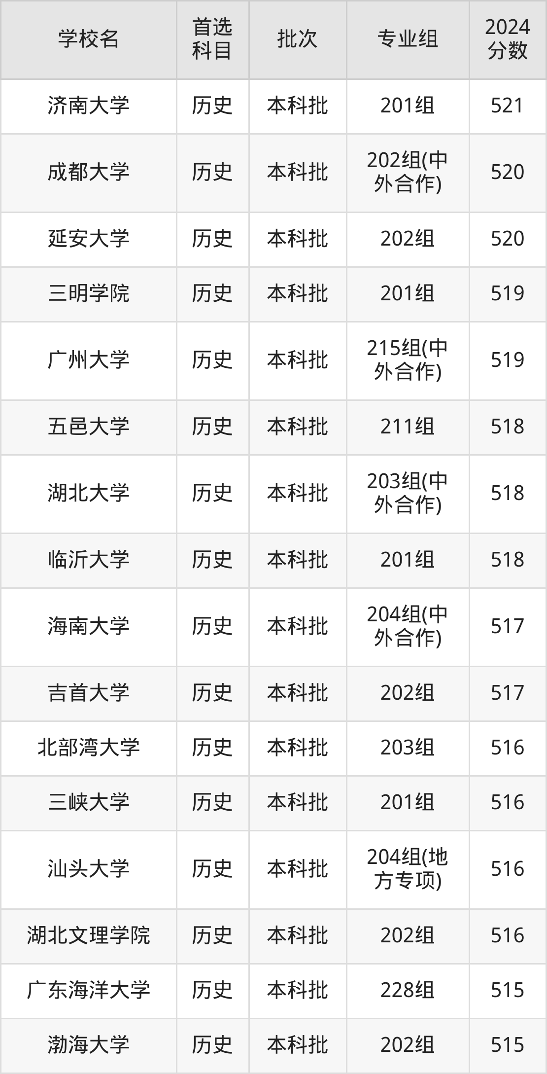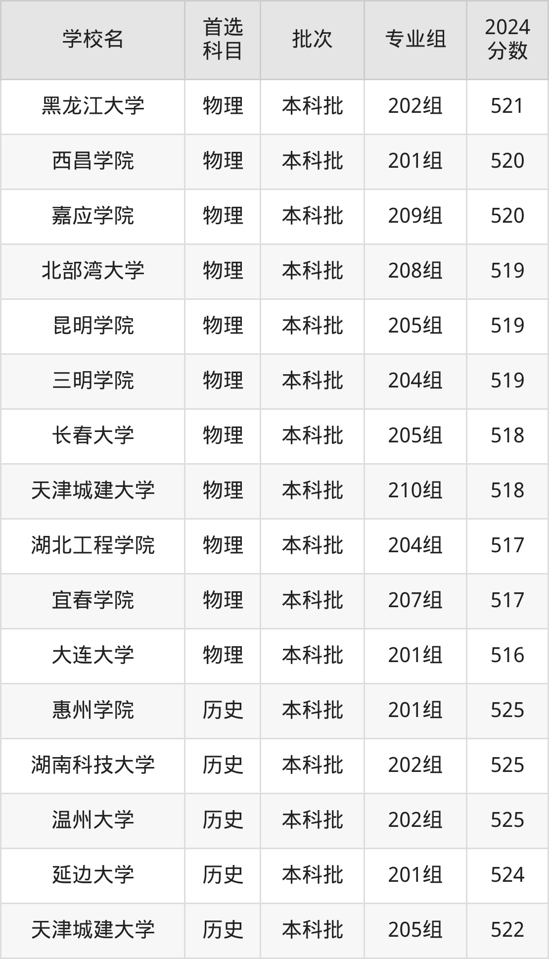 首选历史科目考生能上的有21所,全部在本科批次录取。具体有:惠州学院201组(525分)、湖南科技大学202组(525分)、温州大学202组(525分)、延边大学201组(524分)等。