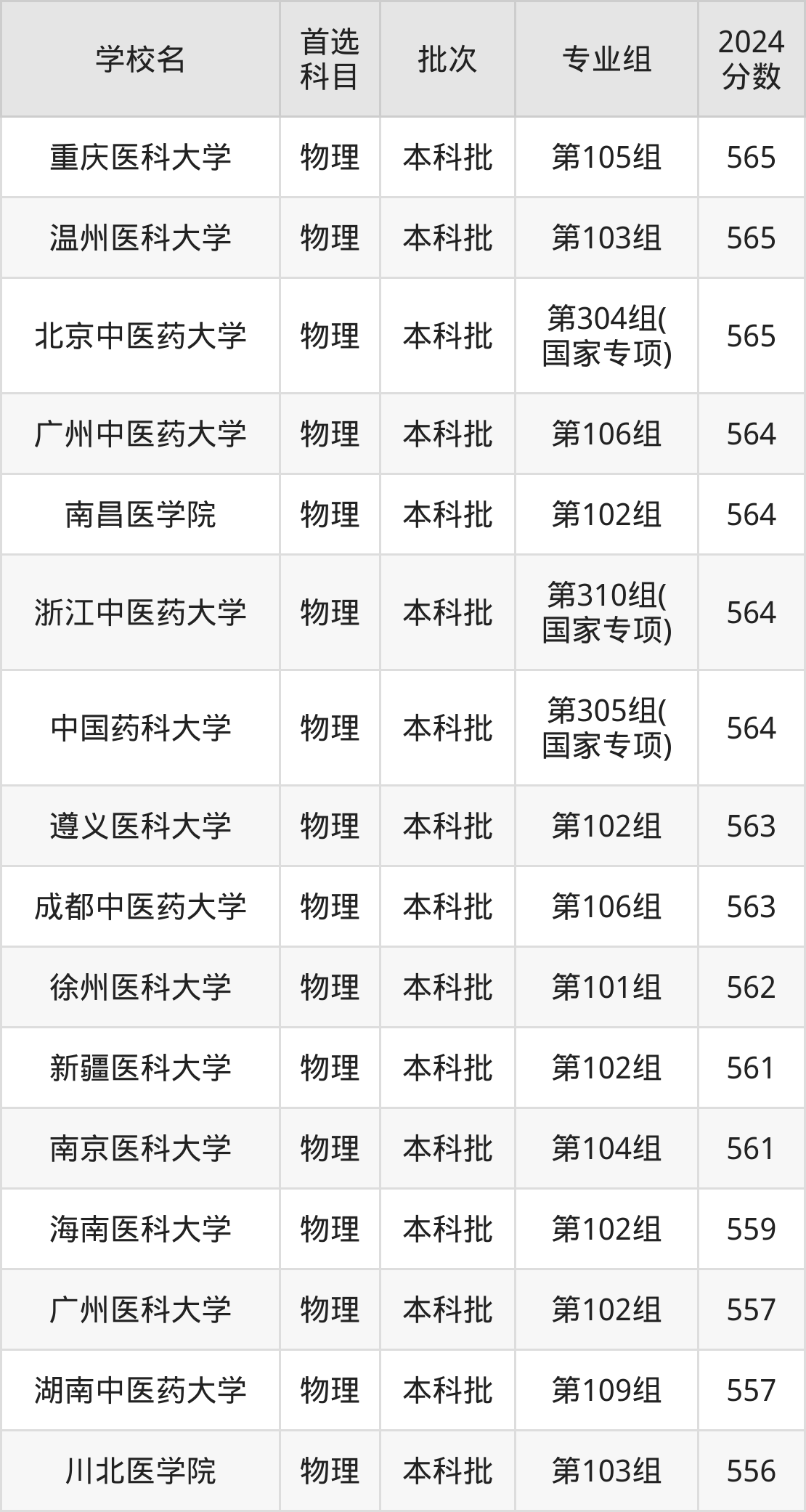 首选物理科目考生能上的有21所,全部在本科批次录取。具体有:重庆医科大学第105组(565分)、温州医科大学第103组(565分)、北京中医药大学第304组(国家专项)(565分)、广州中医药大学第106组(564分)等;