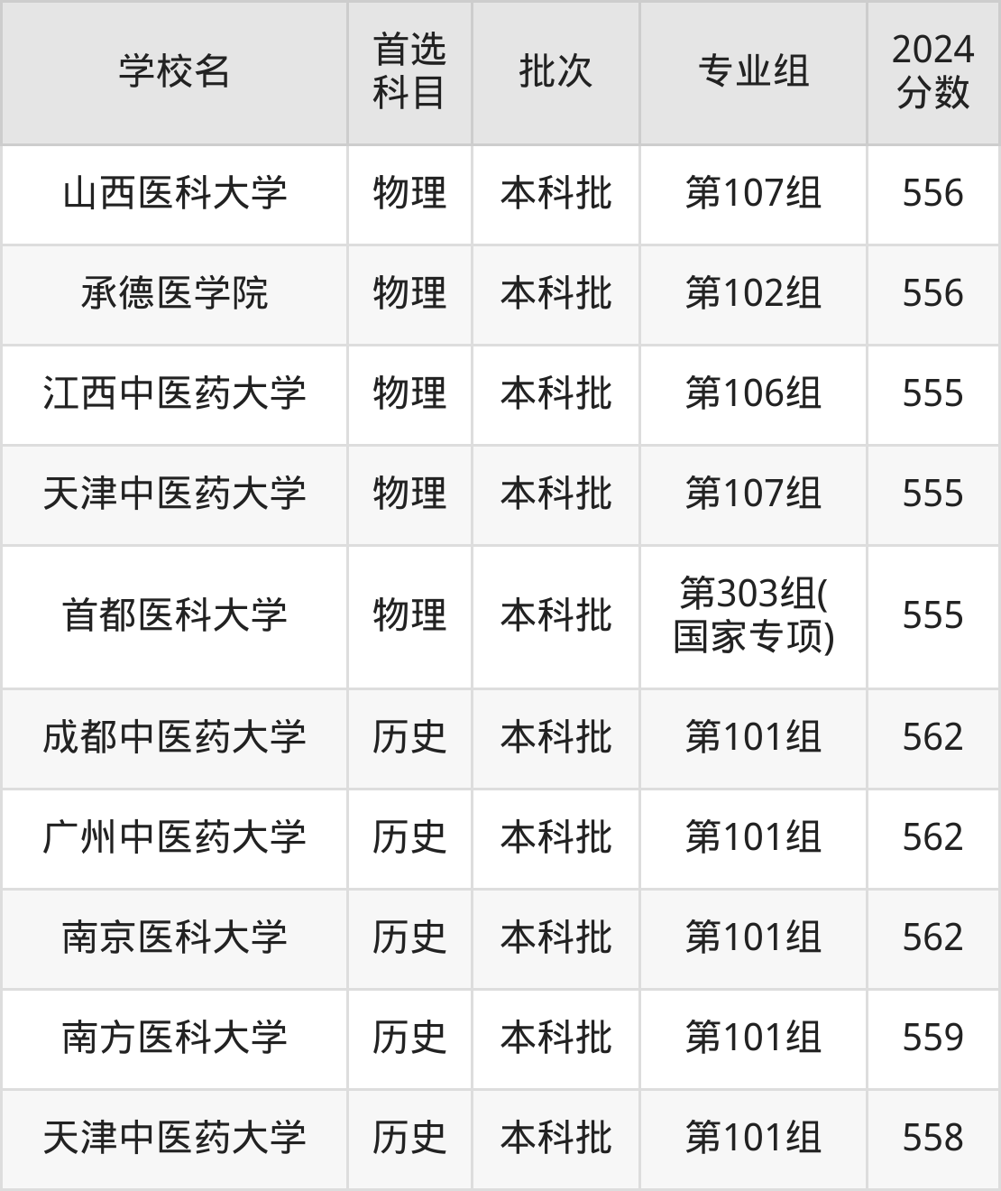 首选历史科目考生能上的有5所,全部在本科批次录取。具体有:成都中医药大学第101组(562分)、广州中医药大学第101组(562分)、南京医科大学第101组(562分)、南方医科大学第101组(559分)等。