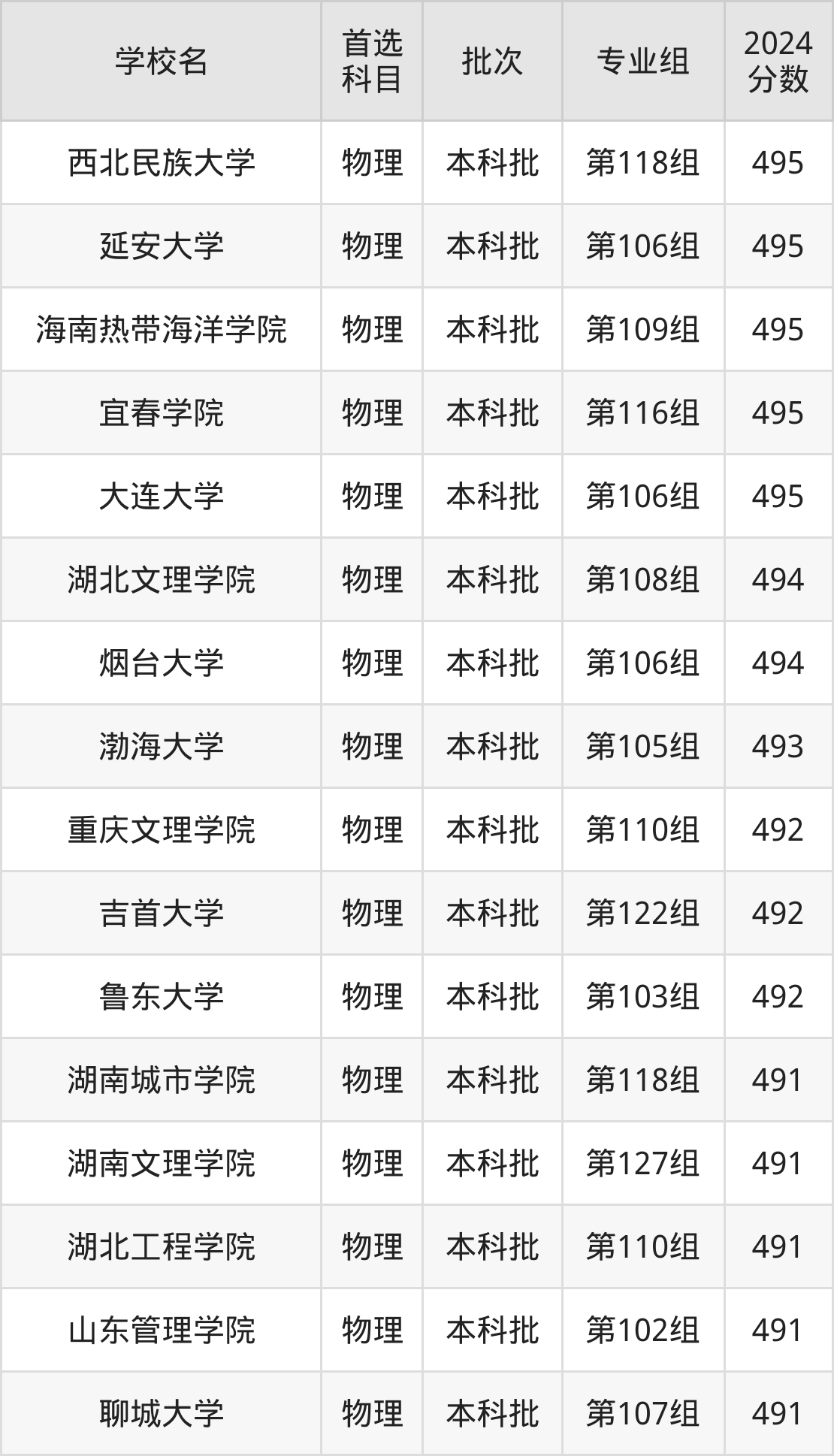 首选物理科目考生能上的有41所,全部在本科批次录取。具体有:西北民族大学第118组(495分)、延安大学第106组(495分)、海南热带海洋学院第109组(495分)、宜春学院第116组(495分)等;