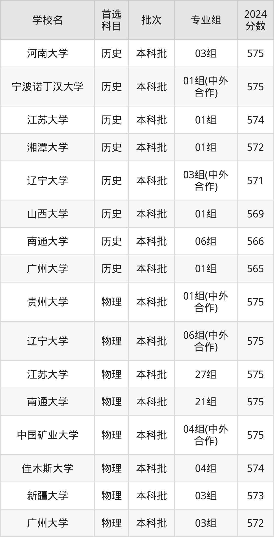 首选物理科目考生能上的有15所,全部在本科批次录取。具体有:贵州大学01组(中外合作)(575分)、辽宁大学06组(中外合作)(575分)、江苏大学27组(575分)、南通大学21组(575分)等。