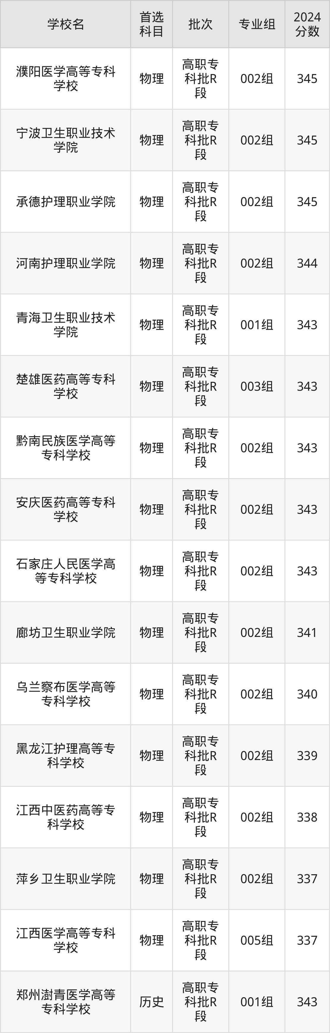 首选物理科目考生能上的有15所,全部在专科批次录取。具体有:濮阳医学高等专科学校002组(345分)、宁波卫生职业技术学院002组(345分)、承德护理职业学院002组(345分)、河南护理职业学院002组(344分)等;