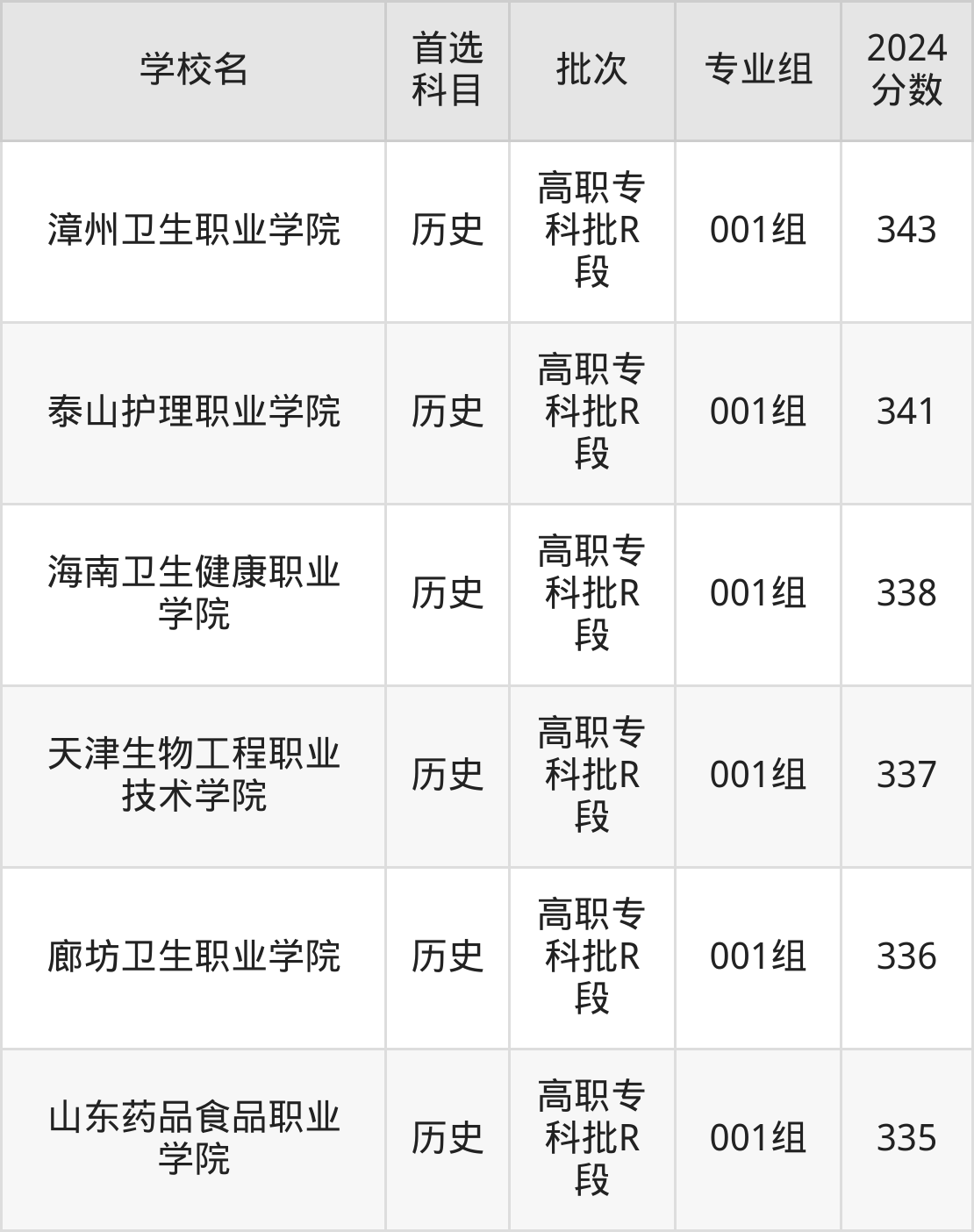 首选历史科目考生能上的有7所,全部在专科批次录取。具体有:郑州澍青医学高等专科学校001组(343分)、漳州卫生职业学院001组(343分)、泰山护理职业学院001组(341分)、海南卫生健康职业学院001组(338分)等。