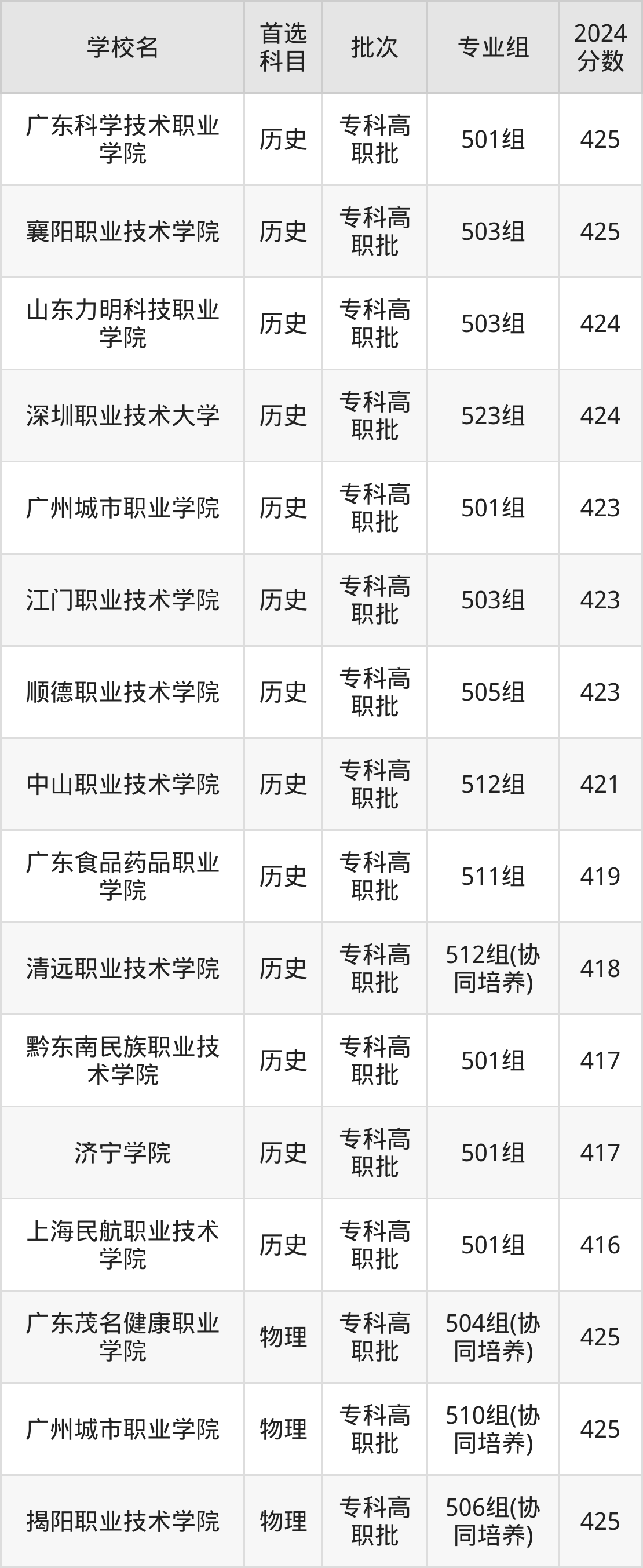 首选历史科目考生能上的有13所,包括2所本科医科大学和11所专科医科大学。具体有:广东科学技术职业学院501组(425分)、襄阳职业技术学院503组(425分)、山东力明科技职业学院503组(424分)、深圳职业技术大学523组(424分)等;