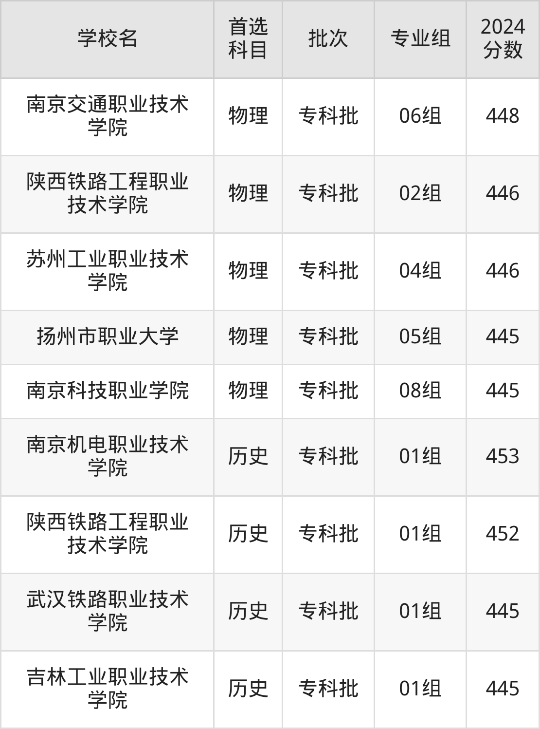 首选历史科目考生能上的有4所,全部在专科批次录取。具体有:南京机电职业技术学院01组(453分)、陕西铁路工程职业技术学院01组(452分)、武汉铁路职业技术学院01组(445分)、吉林工业职业技术学院01组(445分)等。