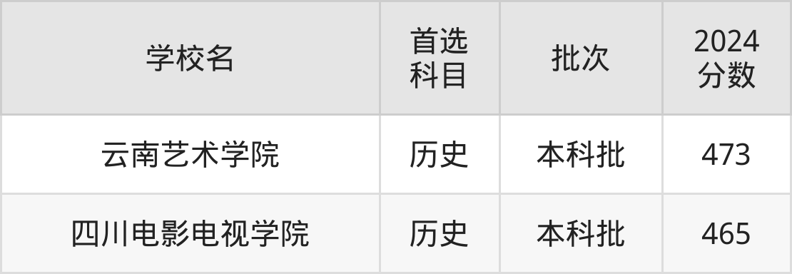 首选历史科目考生能上的有2所,全部在本科批次录取。具体有:云南艺术学院(473分)、四川电影电视学院(465分)。
