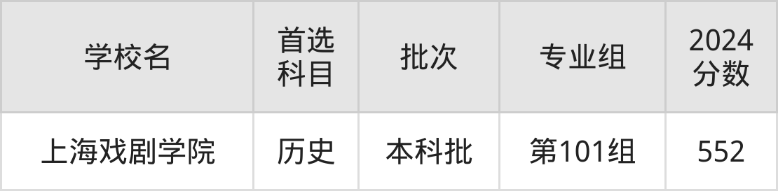 首选历史科目考生能上的有1所,全部在本科批次录取。具体有:上海戏剧学院第101组(552分)。