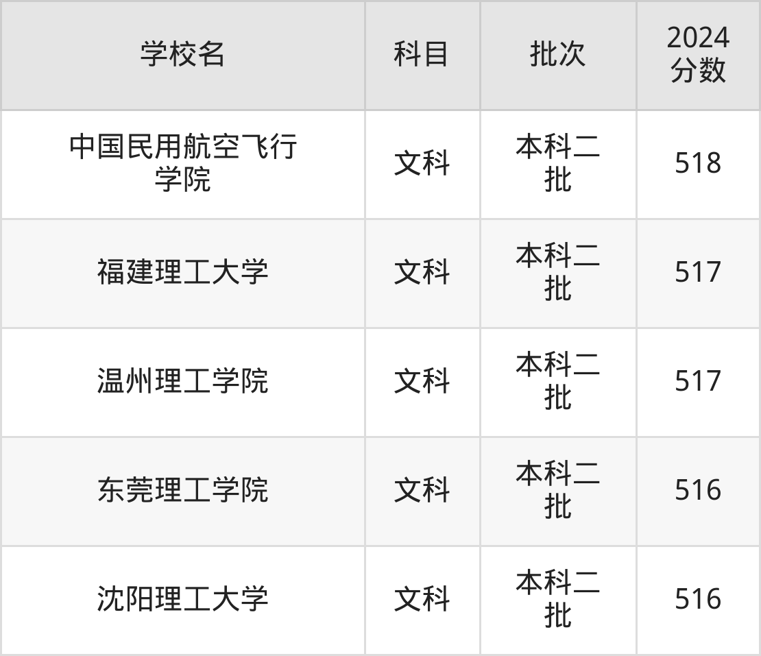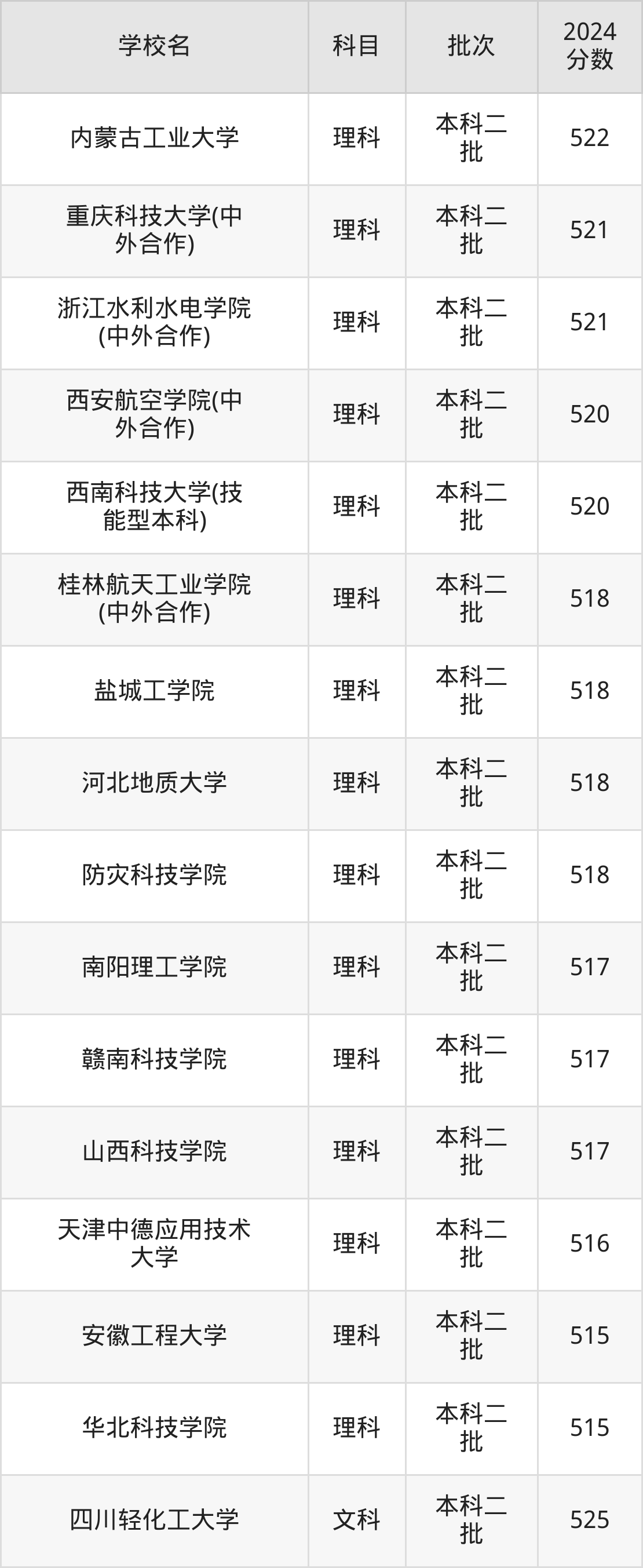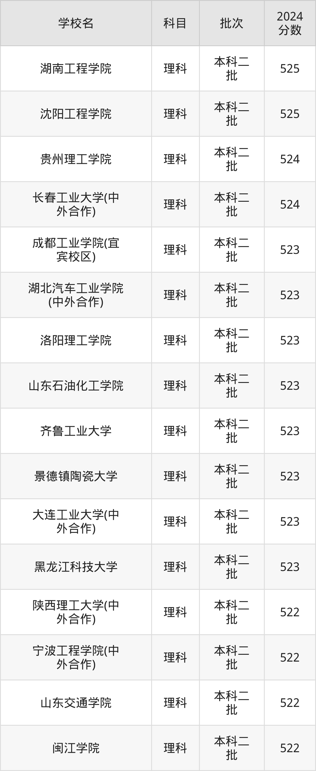 理科科目考生能上的有31所,全部在本科批次录取。具体有:湖南工程学院(525分)、沈阳工程学院(525分)、贵州理工学院(524分)、长春工业大学(中外合作)(524分)等;