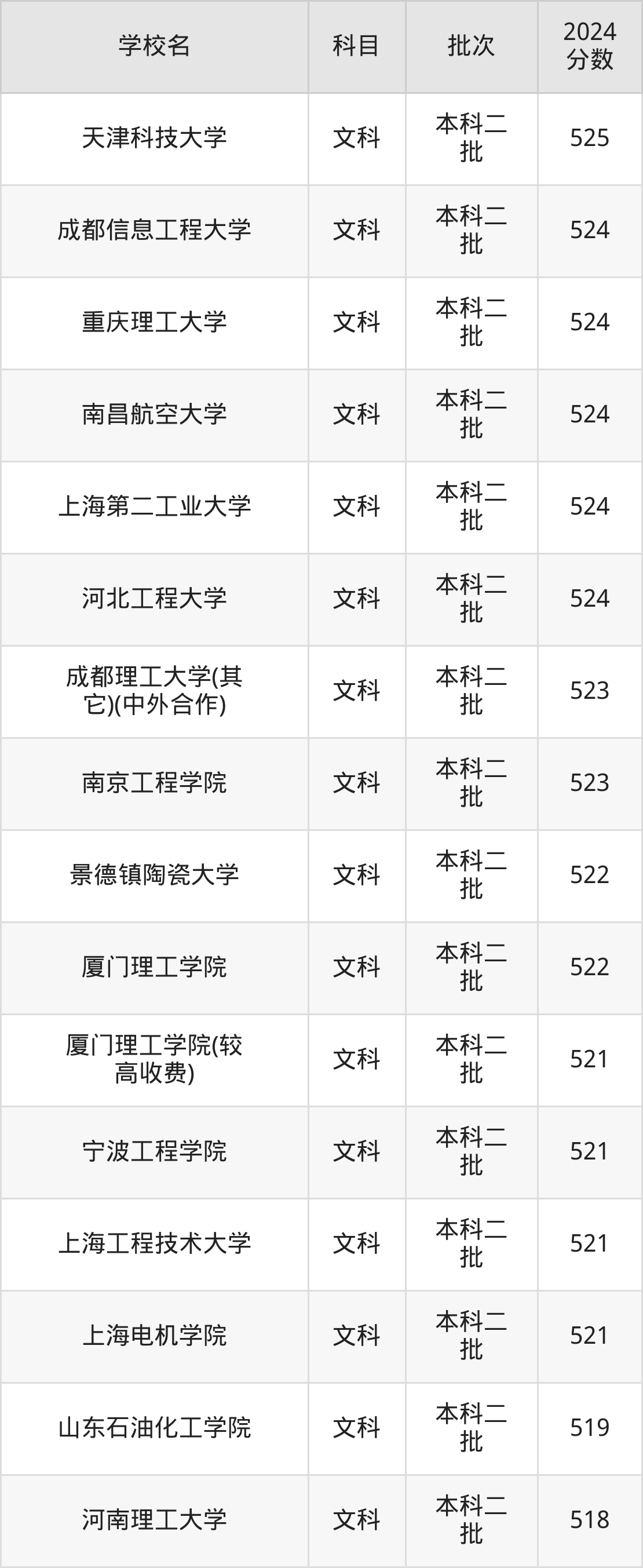 文科科目考生能上的有22所,全部在本科批次录取。具体有:四川轻化工大学(525分)、天津科技大学(525分)、成都信息工程大学(524分)、重庆理工大学(524分)等。