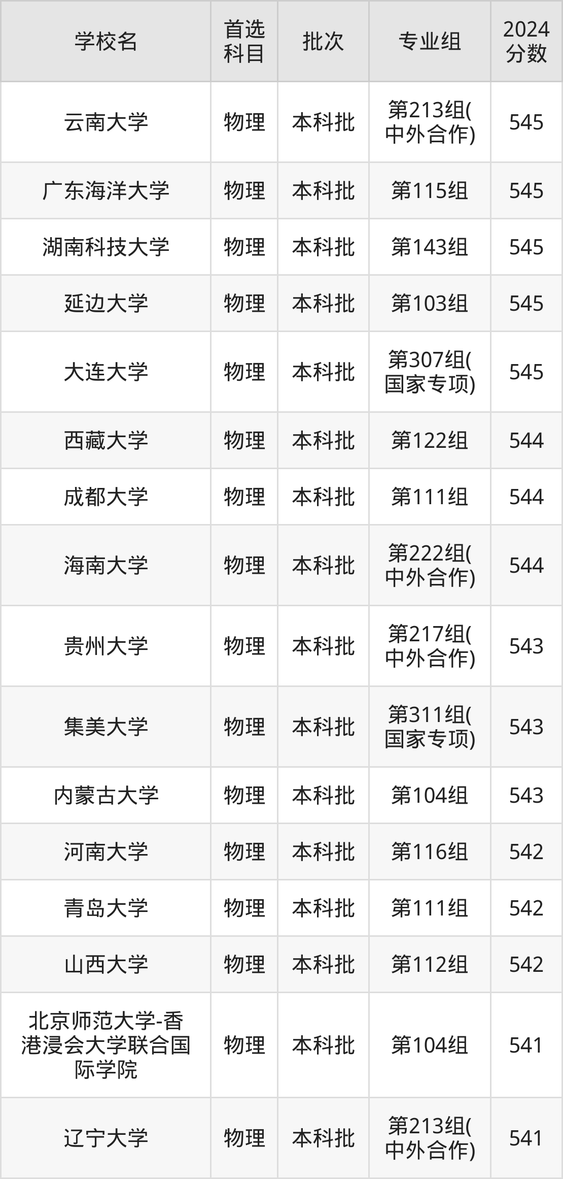 首选物理科目考生能上的有27所,全部在本科批次录取。具体有:云南大学第213组(中外合作)(545分)、广东海洋大学第115组(545分)、湖南科技大学第143组(545分)、延边大学第103组(545分)等;
