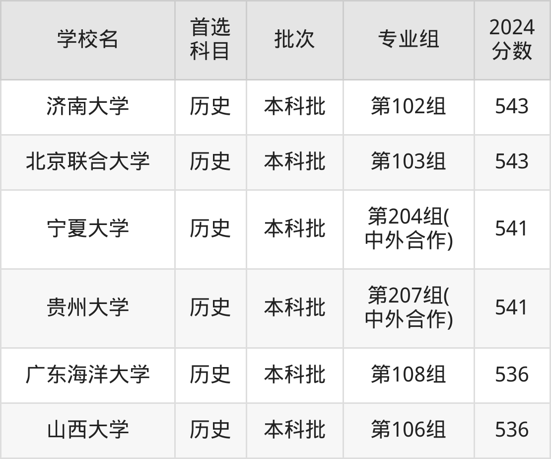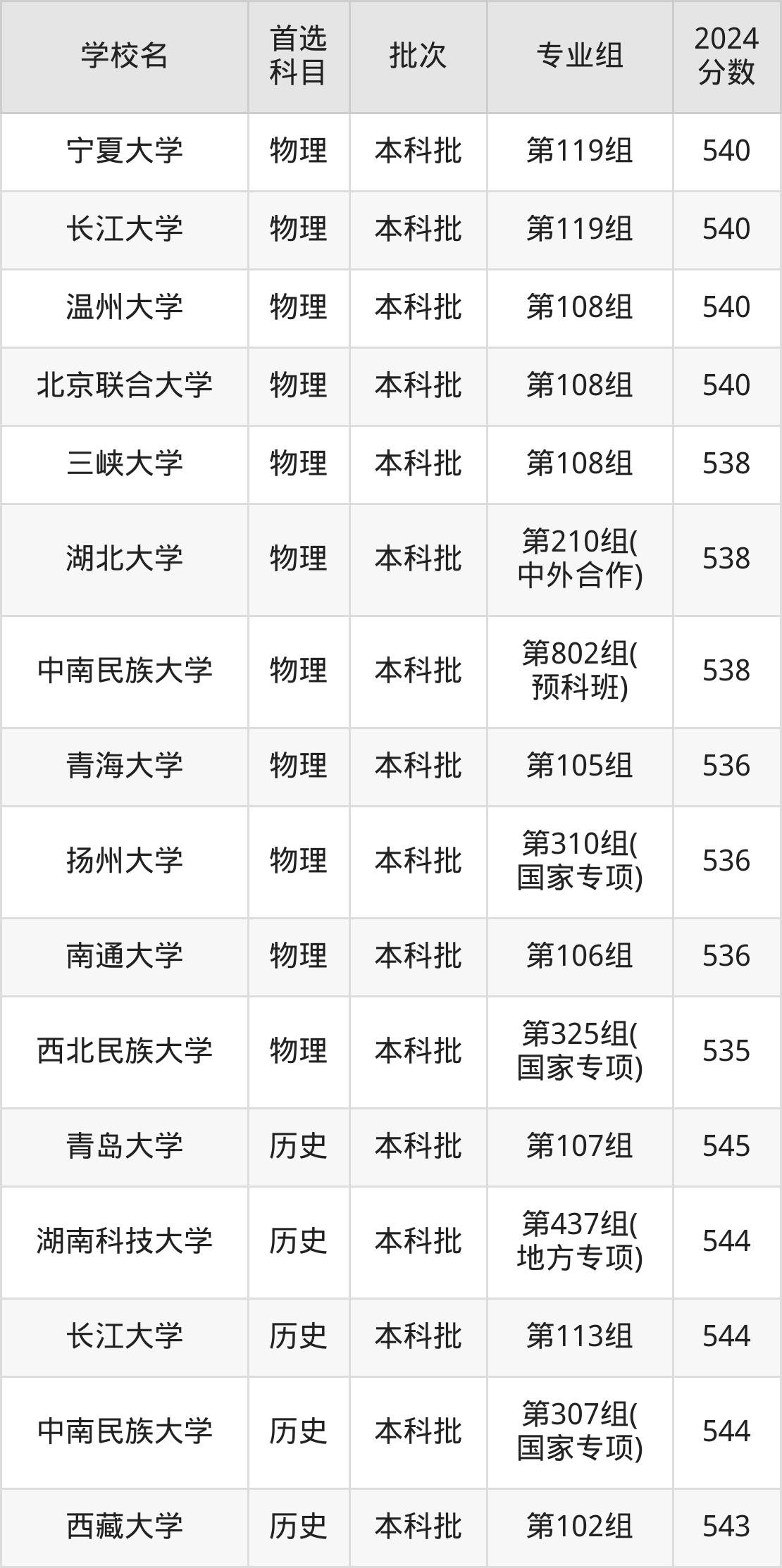 首选历史科目考生能上的有11所,全部在本科批次录取。具体有:青岛大学第107组(545分)、湖南科技大学第437组(地方专项)(544分)、长江大学第113组(544分)、中南民族大学第307组(国家专项)(544分)等。