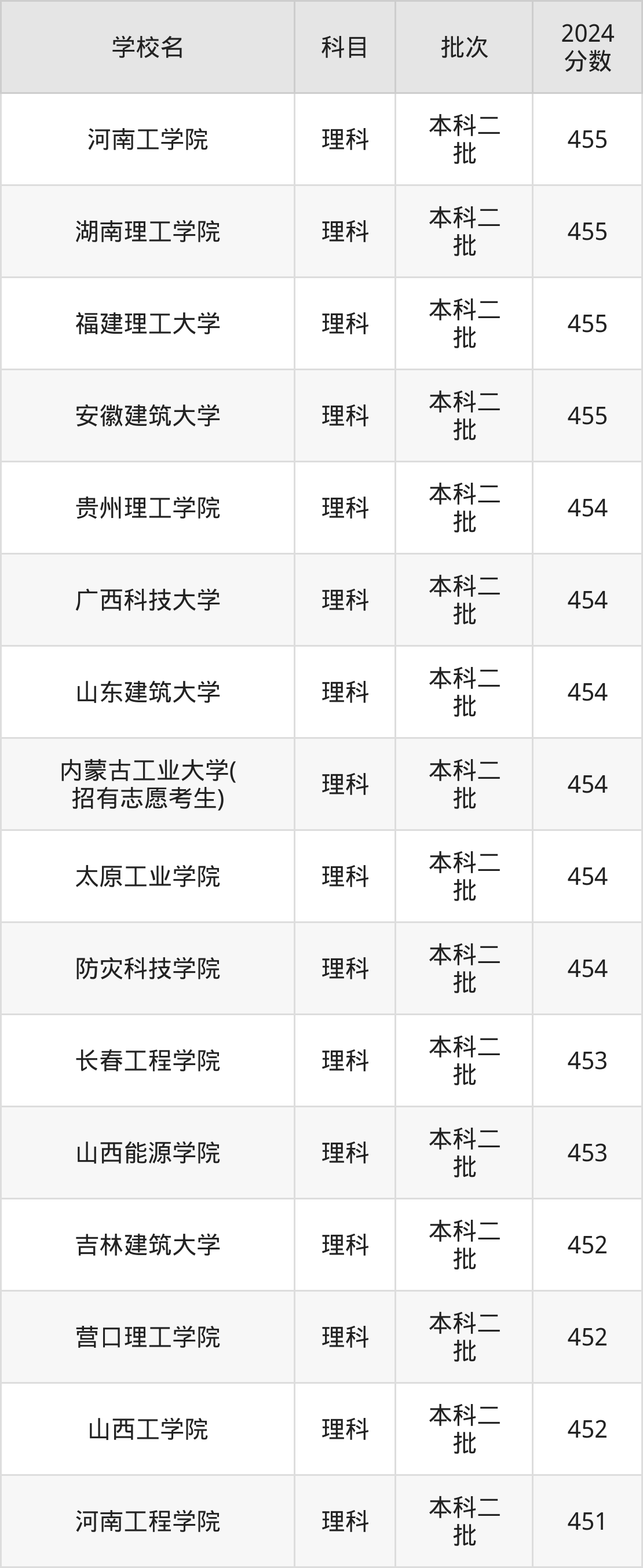 理科科目考生能上的有38所,全部在本科批次录取。具体有:河南工学院(455分)、湖南理工学院(455分)、福建理工大学(455分)、安徽建筑大学(455分)等;