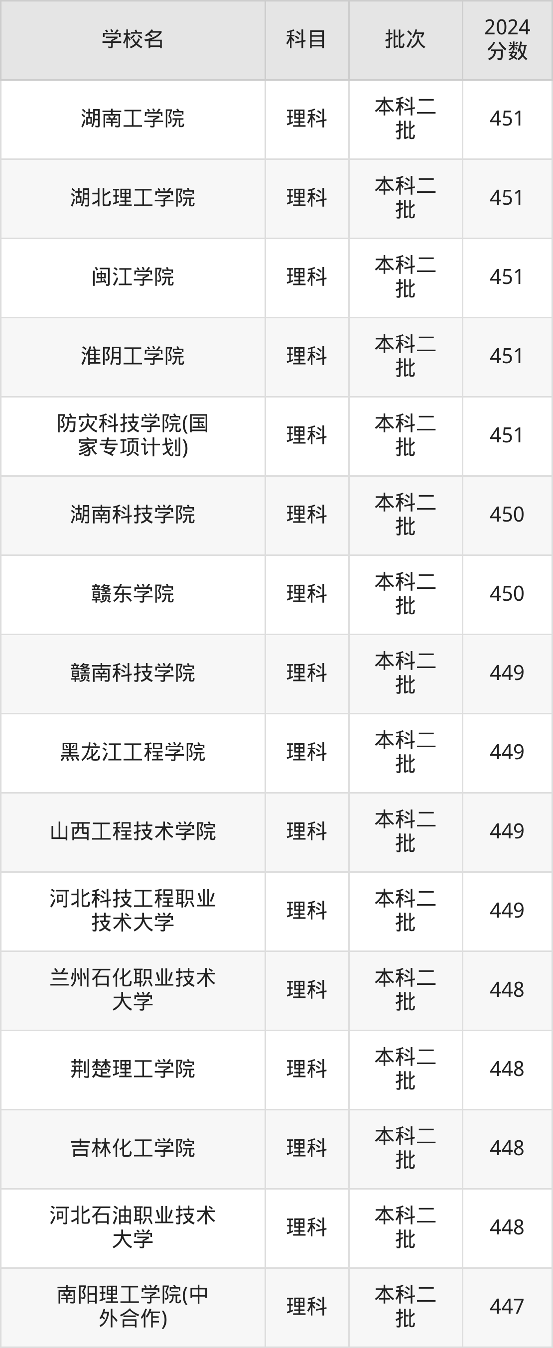 根据2024年高考招录数据,录取分数线刚好为450分的理工类大学有湖南科技学院、赣东学院。下面是这些学校的相关介绍: