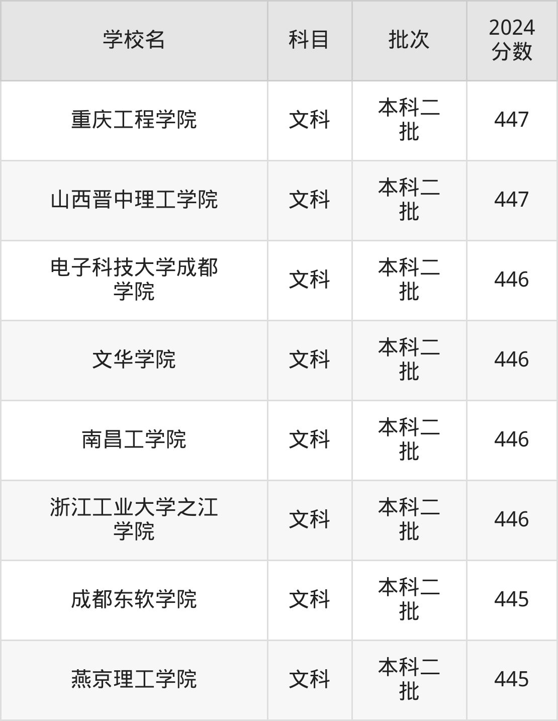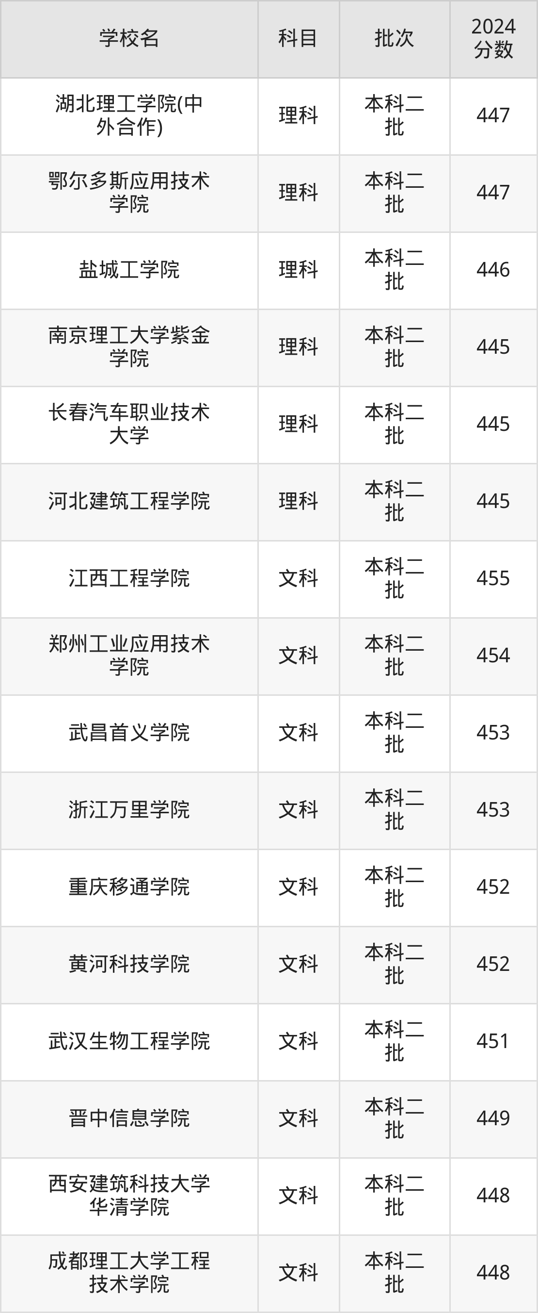 文科科目考生能上的有18所,全部在本科批次录取。具体有:江西工程学院(455分)、郑州工业应用技术学院(454分)、武昌首义学院(453分)、浙江万里学院(453分)等。