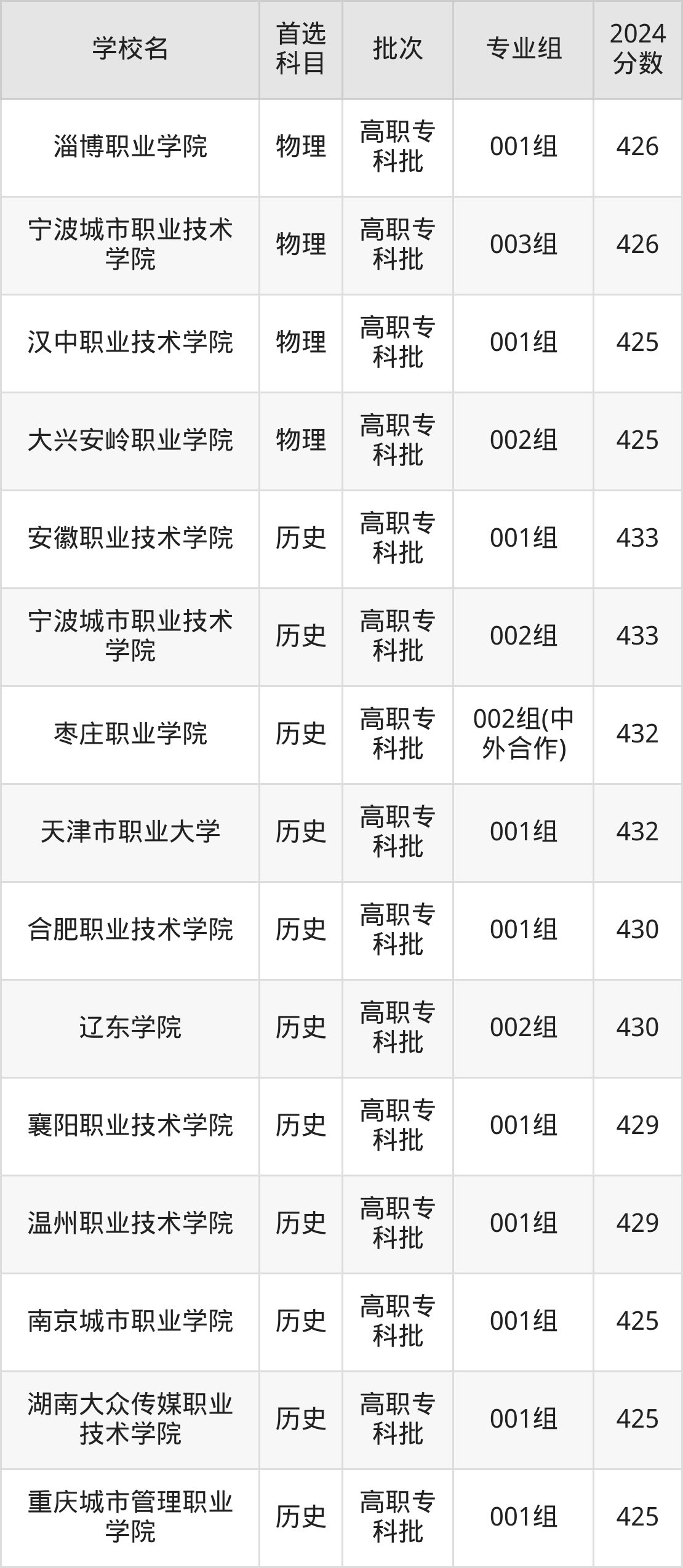 首选物理科目考生能上的有20所,全部在专科批次录取。具体有:安徽职业技术学院002组(中外合作)(435分)、江苏海事职业技术学院002组(435分)、温州科技职业学院001组(434分)、石家庄职业技术学院001组(434分)等;
