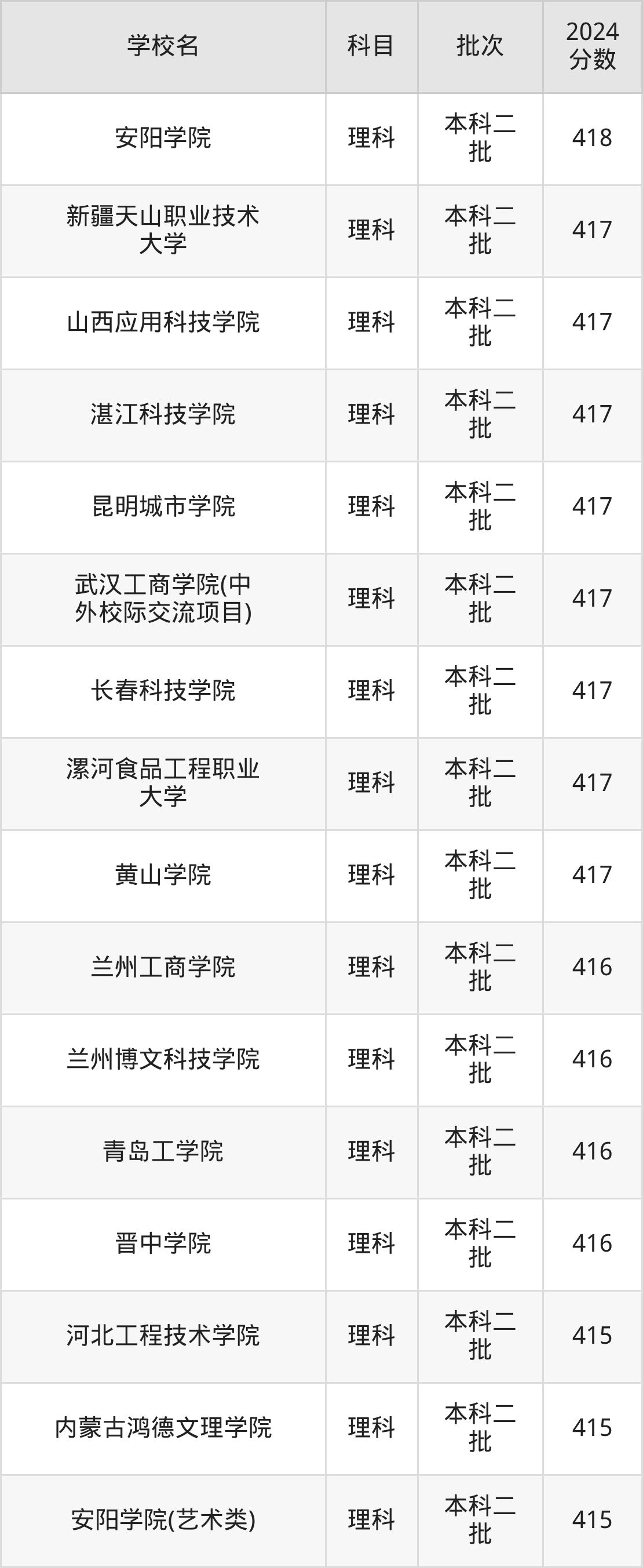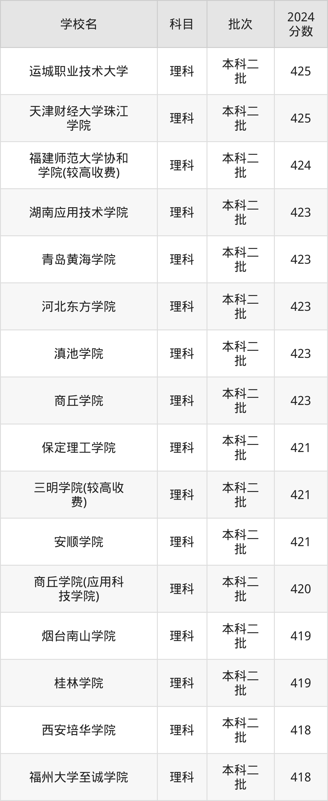 理科科目考生能上的有32所,全部在本科批次录取。具体有:运城职业技术大学(425分)、天津财经大学珠江学院(425分)、福建师范大学协和学院(较高收费)(424分)、湖南应用技术学院(423分)等。