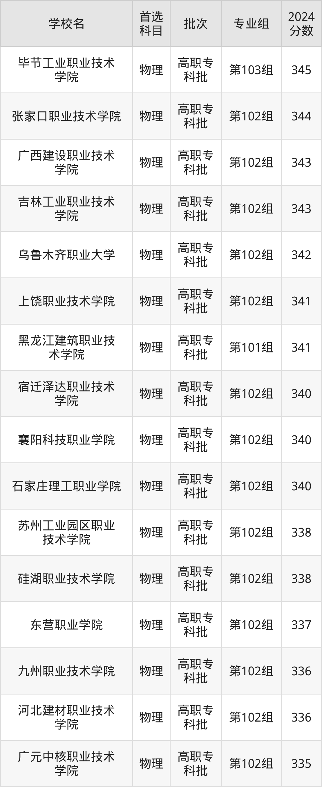 首选物理科目考生能上的有16所,全部在专科批次录取。具体有:毕节工业职业技术学院第103组(345分)、张家口职业技术学院第102组(344分)、广西建设职业技术学院第102组(343分)、吉林工业职业技术学院第102组(343分)等;