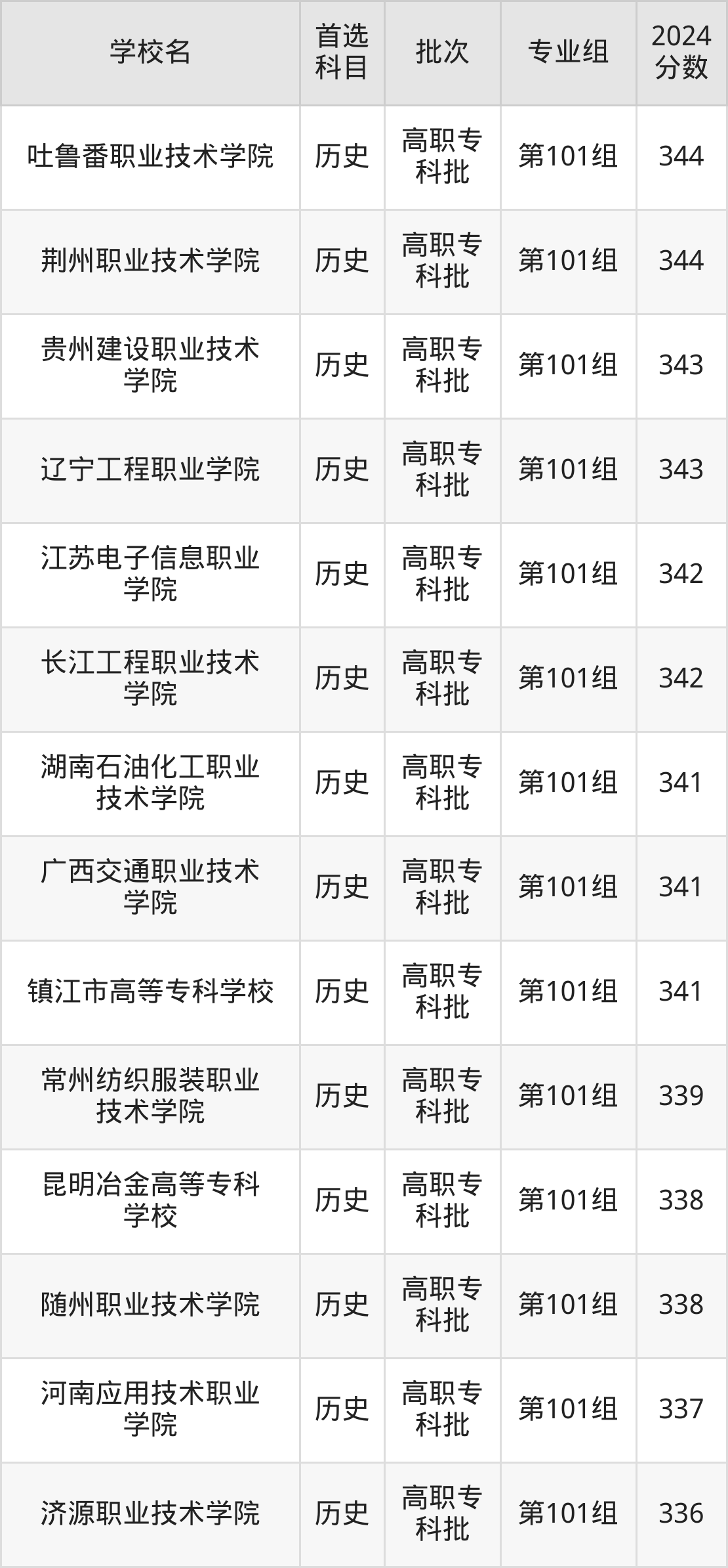 首选历史科目考生能上的有14所,全部在专科批次录取。具体有:吐鲁番职业技术学院第101组(344分)、荆州职业技术学院第101组(344分)、贵州建设职业技术学院第101组(343分)、辽宁工程职业学院第101组(343分)等。