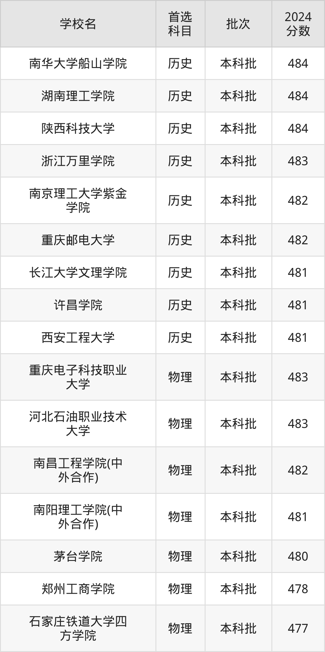 首选历史科目考生能上的有9所,全部在本科批次录取。具体有:南华大学船山学院(484分)、湖南理工学院(484分)、陕西科技大学(484分)、浙江万里学院(483分)等;