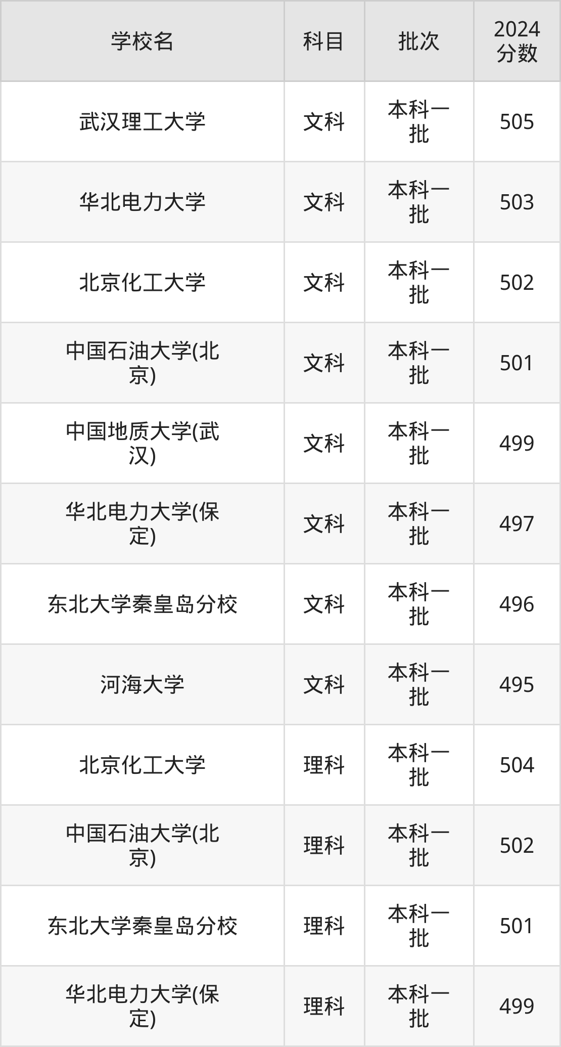 理科科目考生能上的有4所,全部在本科批次录取。具体有:北京化工大学(504分)、中国石油大学(北京)(502分)、东北大学秦皇岛分校(501分)、华北电力大学(保定)(499分)等。